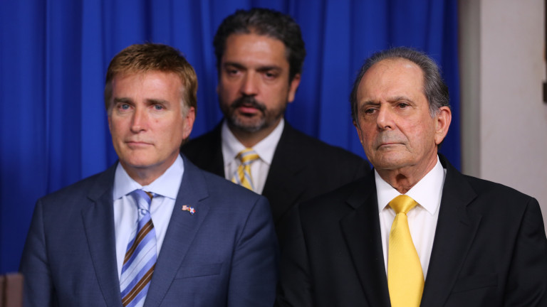 Embajador de los Estados Unidos en el país, James Brewsterel, viceministro de Relaciones Exteriores, José Manuel Trullols y traductor oficial de la Presidencia, al centro.