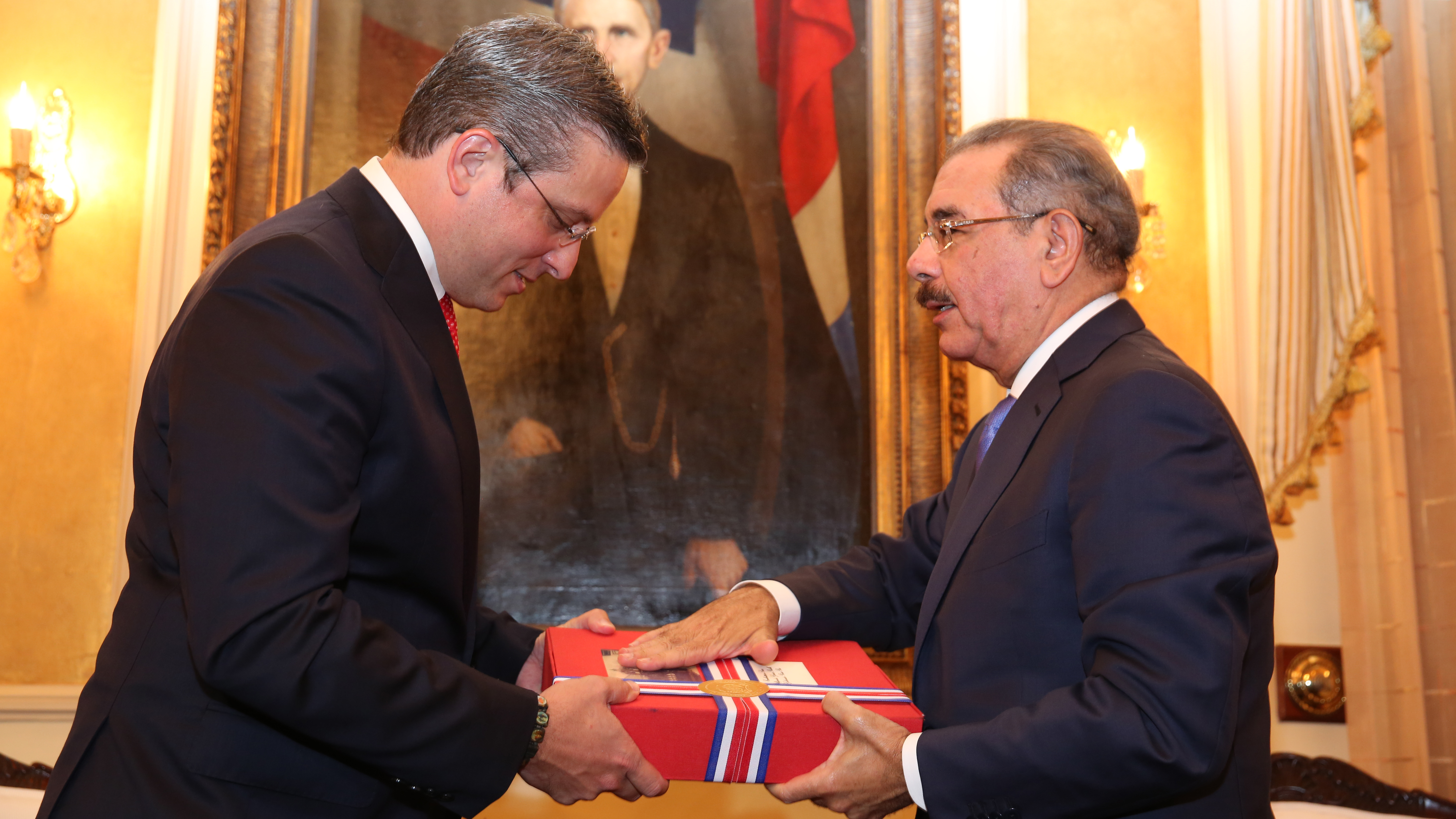 Participación del presidente Danilo Medina durante el intercambio de un presente protocolar con el gobernador de Puerto Rico, Alejandro García Padilla, durante su visita oficial al Palacio Nacional.