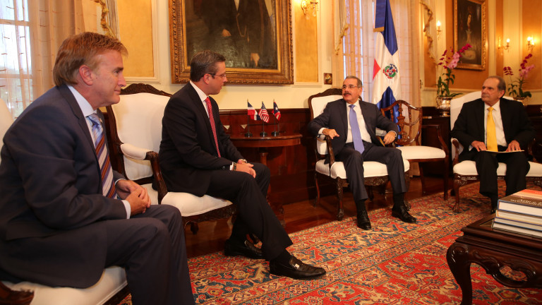 Presidente Danilo Medina Sánchez al recibir la visita oficial del gobernador de Puerto Rico, Alejandro García Padilla acompañado del embajador de Estados Unidos, James (Wally) Brewster y José Manuel Trullols, viceministro de Relaciones Exteriores del país, en despacho del mandatario en el Palacio Nacional.