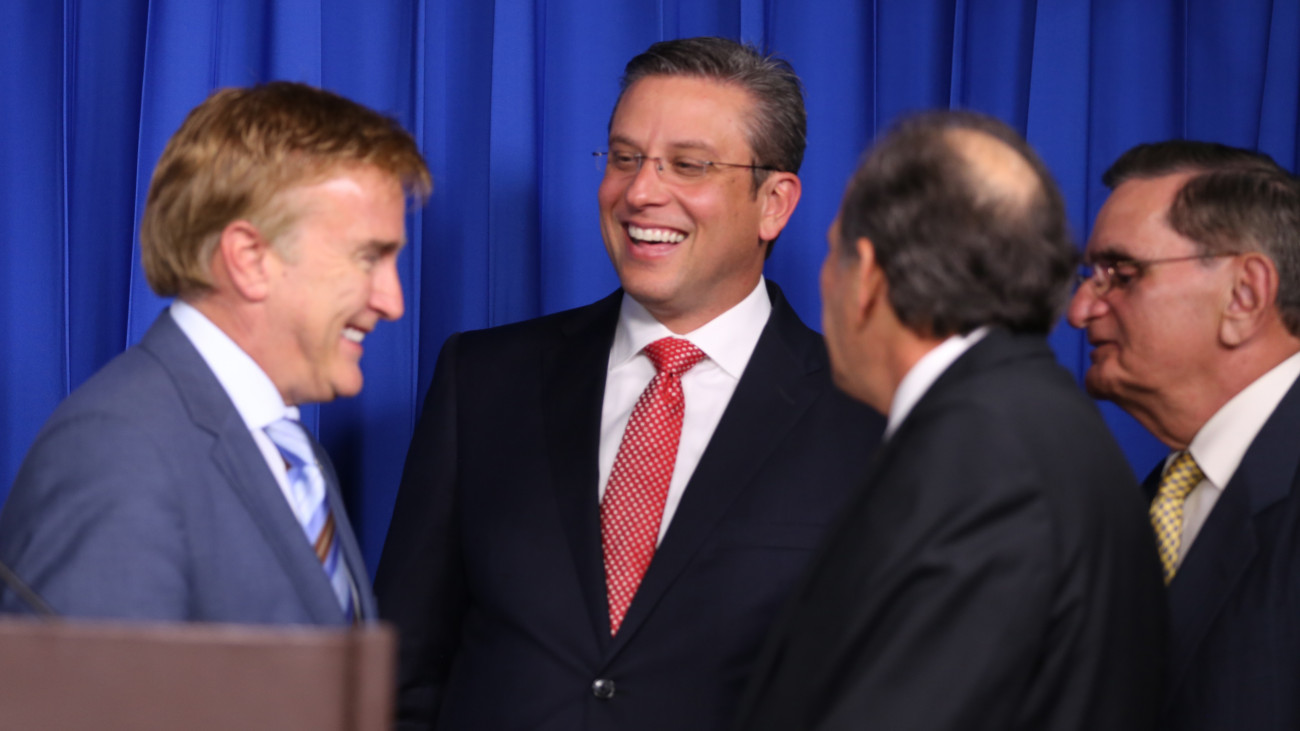 Participación del gobernador de Puerto Rico, Alejandro García Padilla y comitiva presente, durante encuentro con periodistas dominicanos, efectuado en el Salón Orlando Martínez del Palacio Nacional.