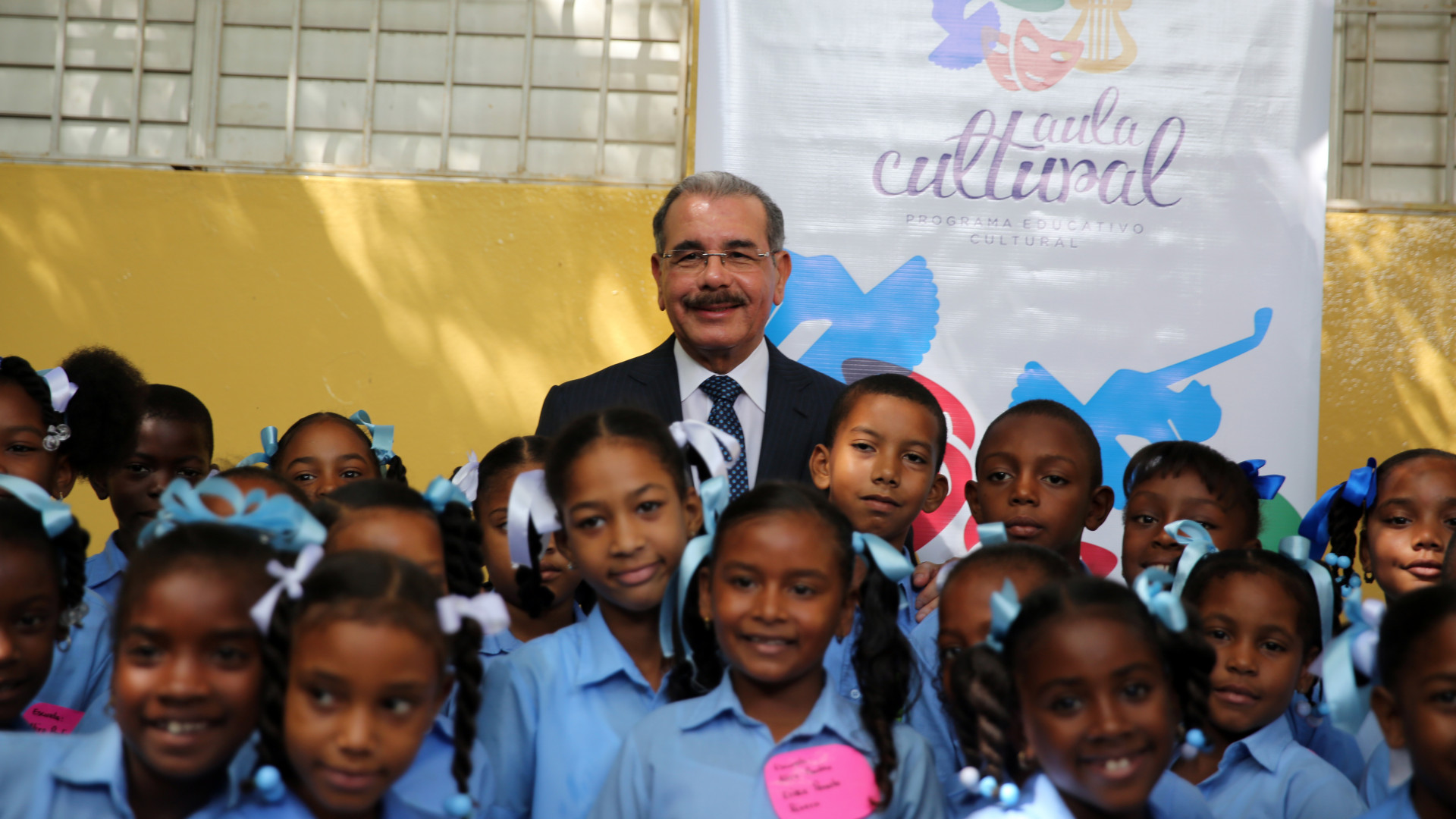 Presidente Danilo Medina Sánchez junto a un grupo de estudiantes de Haina, Don Gregorio y Nizao participantes del programa educativo Aula Cultural del Ministerio de Educación y Refinería Dominicana de Petróleo (REFIDOMSA).