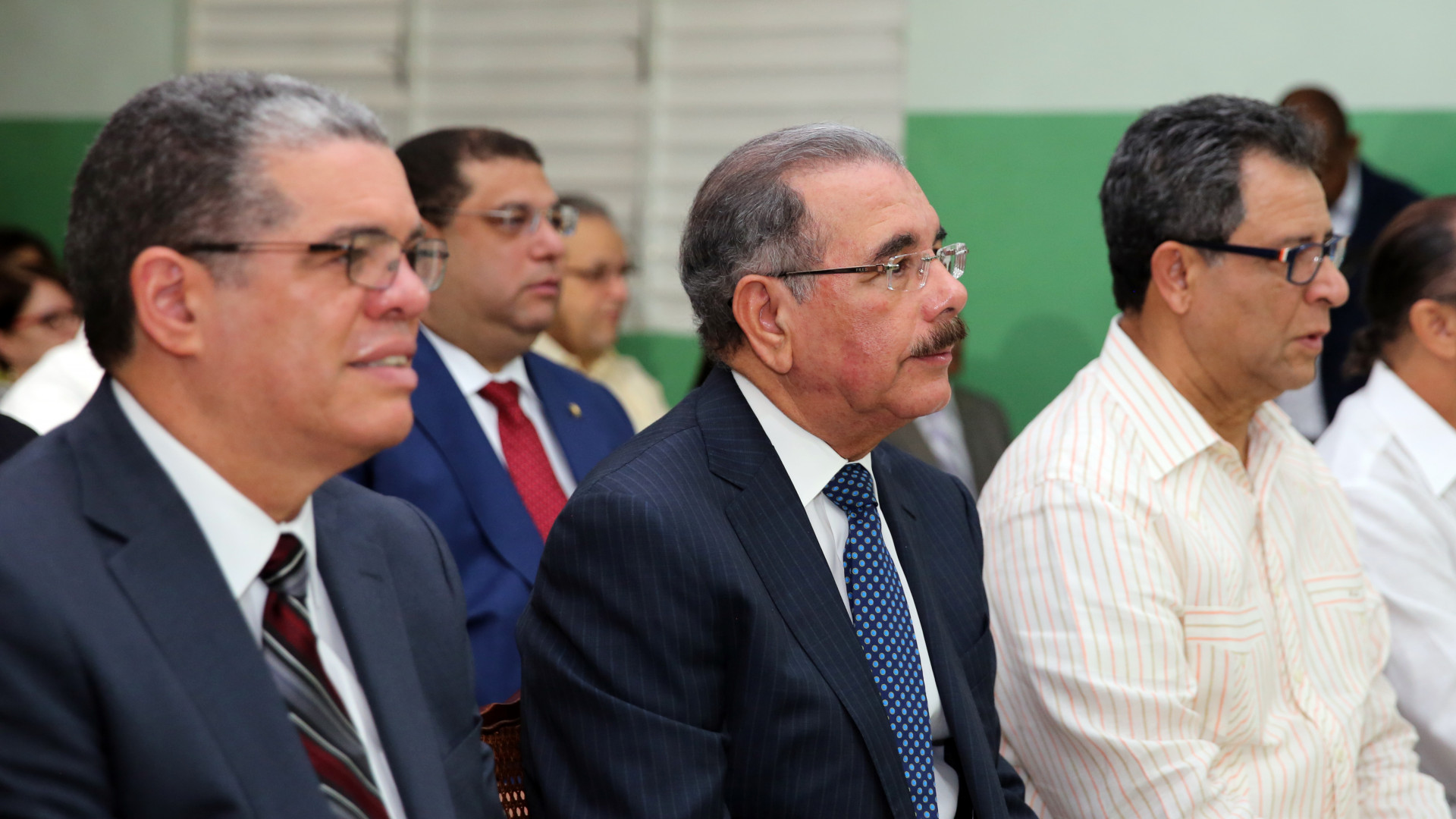 Presidente Danilo Medina Sánchez junto a Carlos Amarante Baret, ministro de Educación, Félix (Felucho) Jiménez, presidente de REFIDOMSA y José Antonio Rodríguez, ministro de Cultura, presentes en acto cultural estudiantil en Nizao, San Cristóbal.