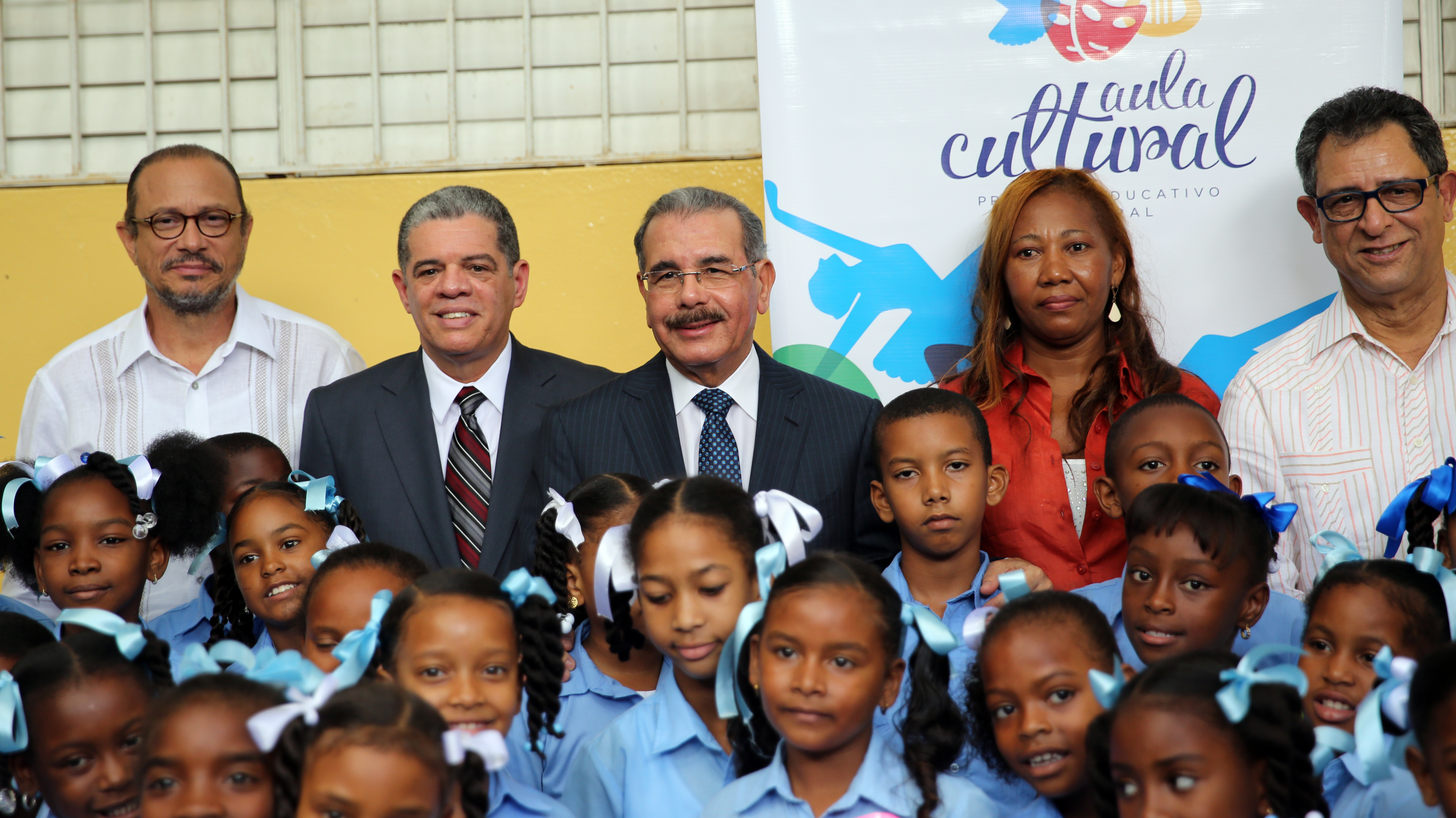Presidente Danilo Medina junto a los ministros, Carlos Amarante, de Educación y José Antonio Rodríguez, de Cultura; Féliz Jiménez, presidente de REFIDOMSA; directora del centro y estudiantes de Haina, Don Gregorio y Nizao, San Cristóbal .