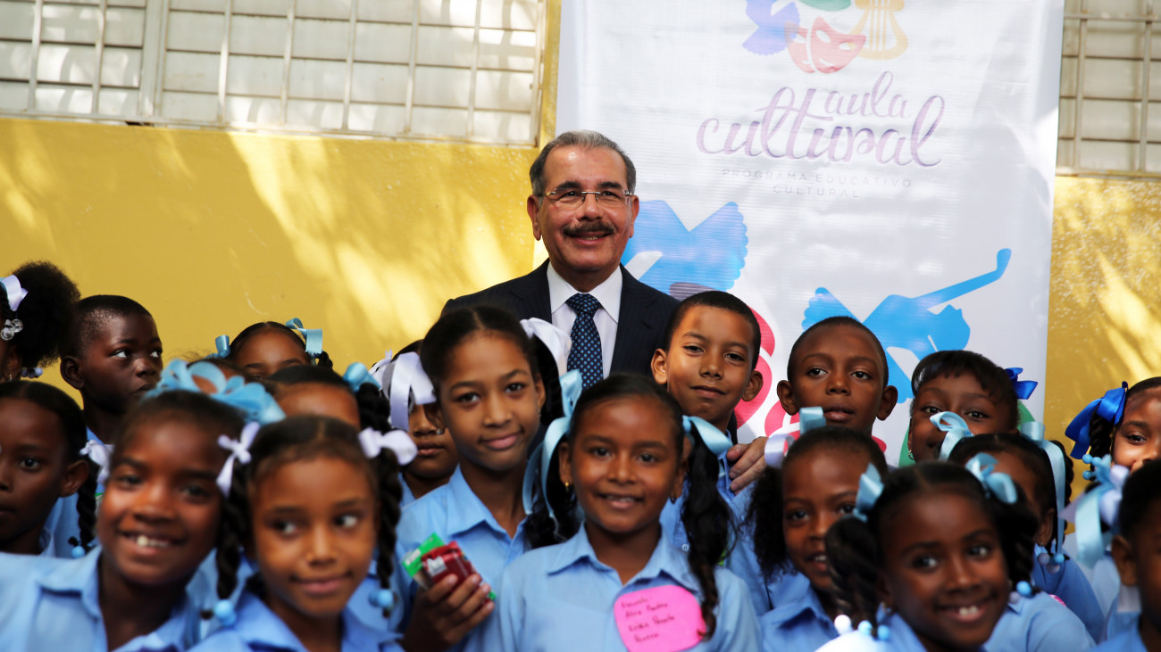 Presidente de la República, Danilo Medina Sánchez junto a un grupo de estudiantes de Haina, Don Gregorio y Nizao participantes del programa educativo Aula Cultural del Ministerio de Educación y Refinería Dominicana de Petróleo (REFIDOMSA).