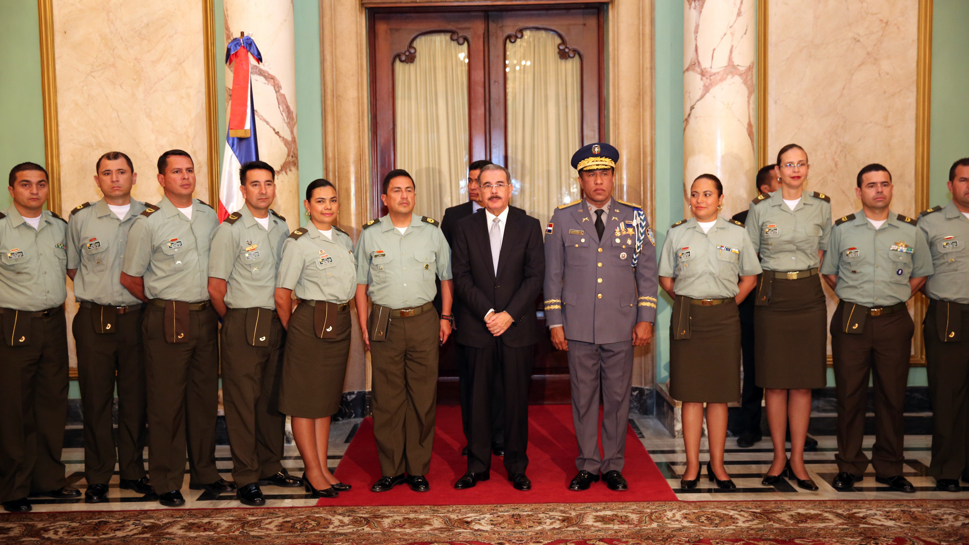 Al centro, Presidente Danilo Medina, acompañado del mayor general Manuel Castro Castillo, jefe de la Policía Nacional dominicana y los oficiales superiores de Bogotá.