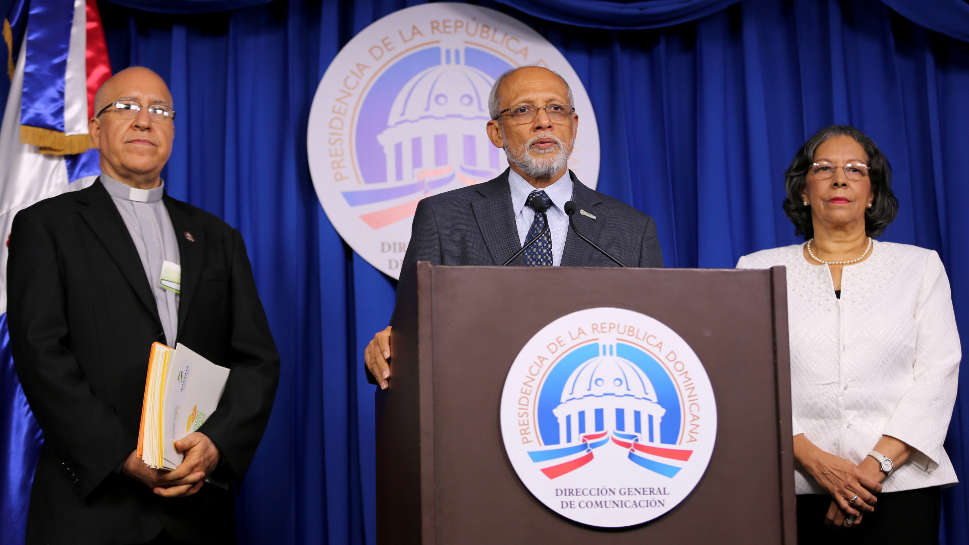 Padre Prudencio Miguel Piña, director de las Escuelas Radiofónicas Santa María; Pedro Luis Castellanos, coordinador de Programas Especiales de la Presidencia y Miriam Camilo Recio, directora general de Educación de Jóvenes y Adultos del Ministerio de Educación.