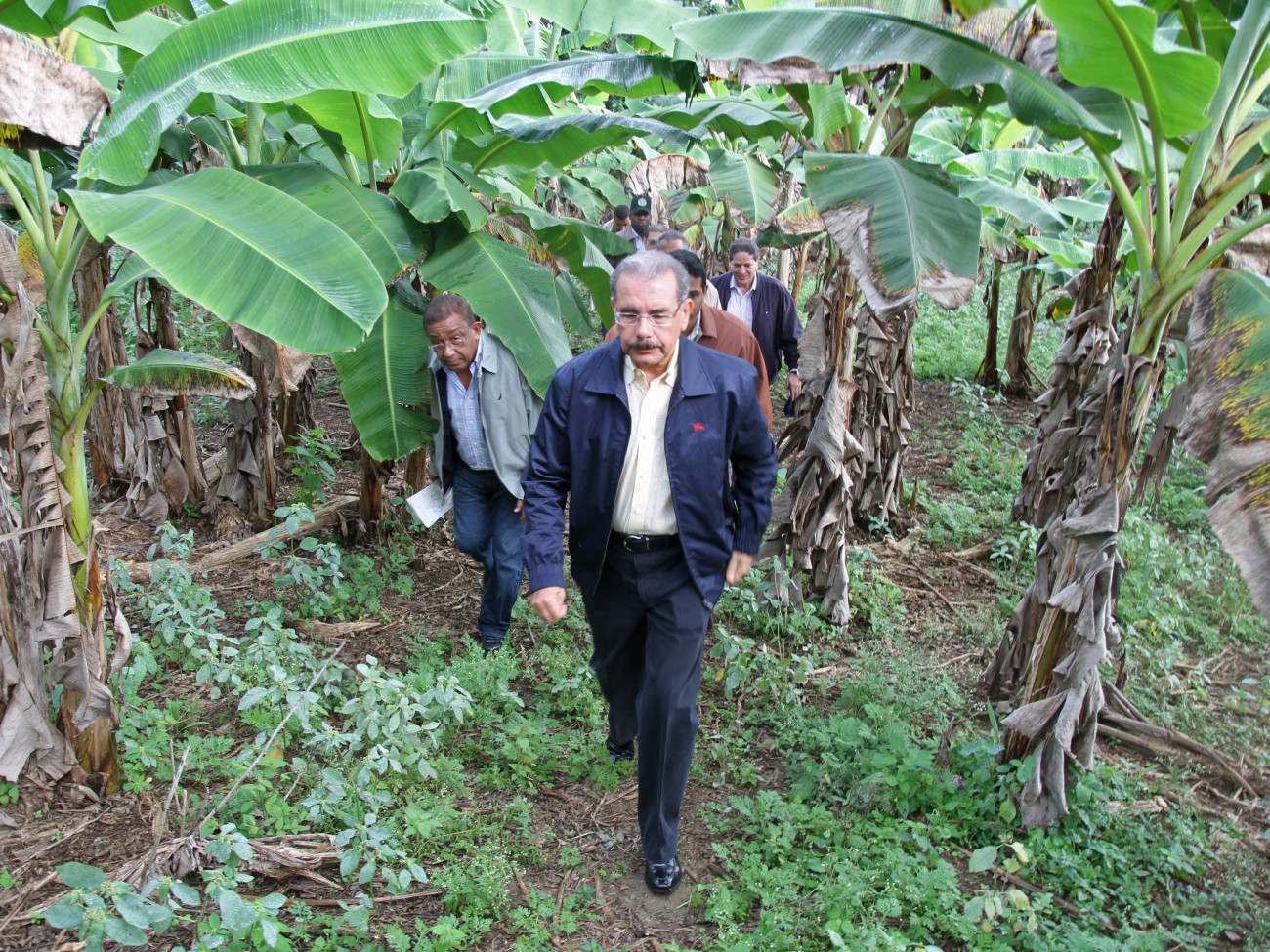 Presidente Medina recorre un platanal detrás del cual se encuentra el dique Barracote, del río Yuna.