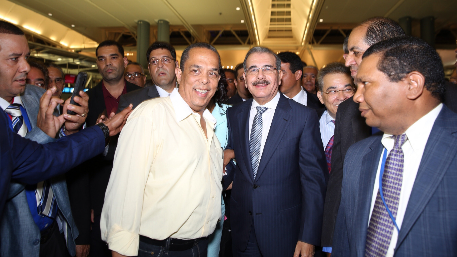 El presidente Danilo Medina y esposa señora Cándida montilla de Medina a su llegada por el Aeropuerto Internacional John F. Kennedy. Integraron la comisión de bienvenida, el embajador dominicano Aníbal de Castro; el embajador Representante Permanente del país ante la ONU, Francisco Antonio Cortorreal y el embajador alterno Marcos Montilla, entre otros.
