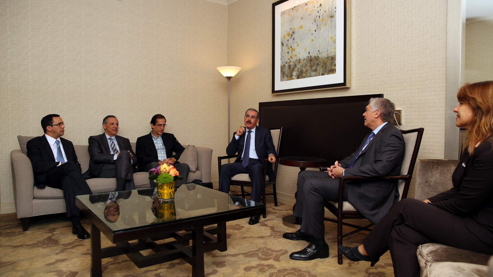 Reunión del presidente Danilo Medina con el presidente y director ejecutivo de AES Corporation, Andrés R. Gluski y Scarlett Álvarez Uzcategui, directora de relaciones con inversionistas de la compañía multinacional dedicada a la generación y distribución de energía eléctrica.