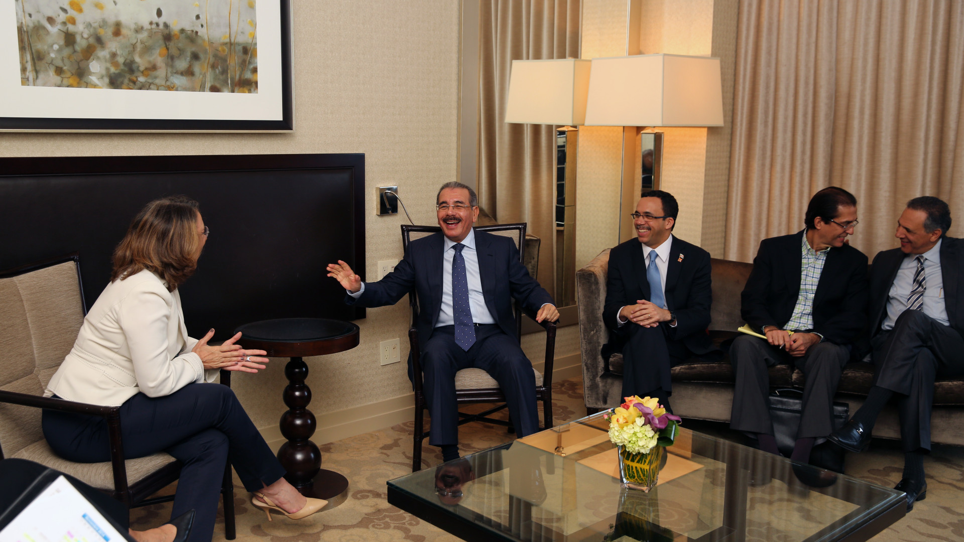 Reunión del presidente Danilo Medina con la secretaria general Iberoamericana, Rebeca Grynspan, junto al canciller, Andrés Navarro; los ministros Gustavo Montalvo, y José Ramón Peralta , en ocasión del viaje para asistir a la Asamblea General de la ONU, en ciudad de New York.
