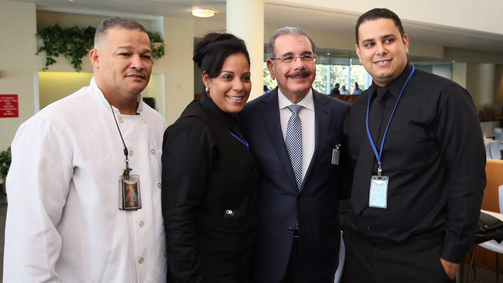 Presidente Danilo Medina junto a Juana Felipe, Lenny Polanco y Mayobanex Parra, dominicanos radicados en la ciudad de New York que laboran en la sede de la ONU.