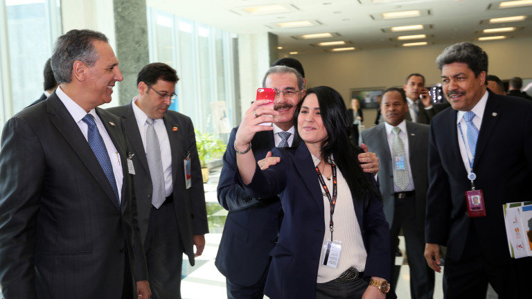 El presidente Medina saludó y compartió por unos minutos con dominicanos que laboran en la ONU.