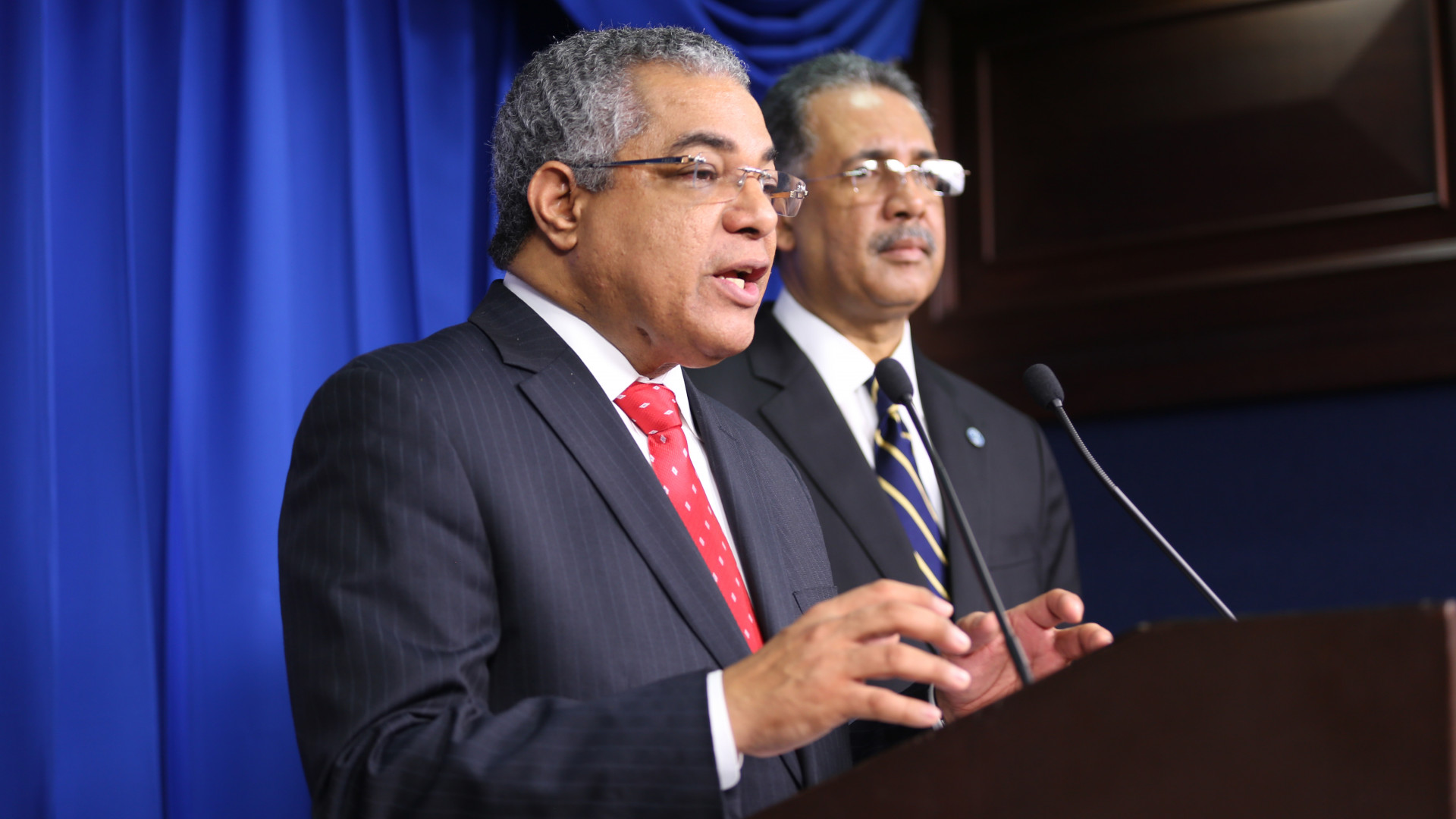Simón Lizardo Mézquita, ministro de Hacienda de la República y Luis Reyes Santos, director general de Presupuesto, al encabezar conferencia de prensa sobre presupuesto 2015, ante periodistas presentes en el Salón Orlando Martínez, del Palacio Nacional Foto: Ángel Álvarez Rodríguez/Presidencia República Dominicana Nota de prensa: presidencia.gob.do/noticias/un-presupuesto-responsable-eq...