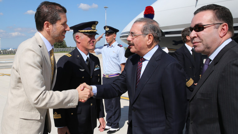 Presidente de la República Danilo Medina saluda a Mario Arvelo, representante permanente de la República Dominicana ante las Agencias de Naciones Unidas en Roma, y presidente del Comité de Agricultura de la FAO, e integrante de la comitiva de bienvenida a su llegada al Aeropuerto de Roma-Ciampino.