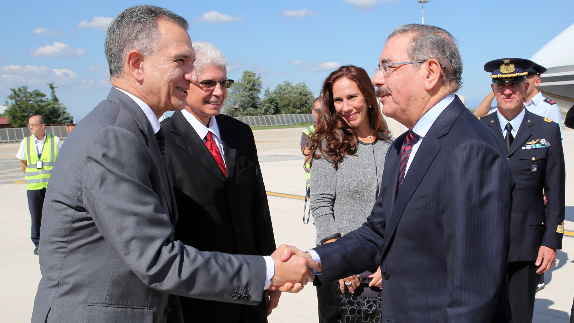 Presidente Medina saluda al embajador ante la Santa Sede, Víctor Grimaldi, durante llegada del Mandatario por el Aeropuerto de Roma-Ciampino.