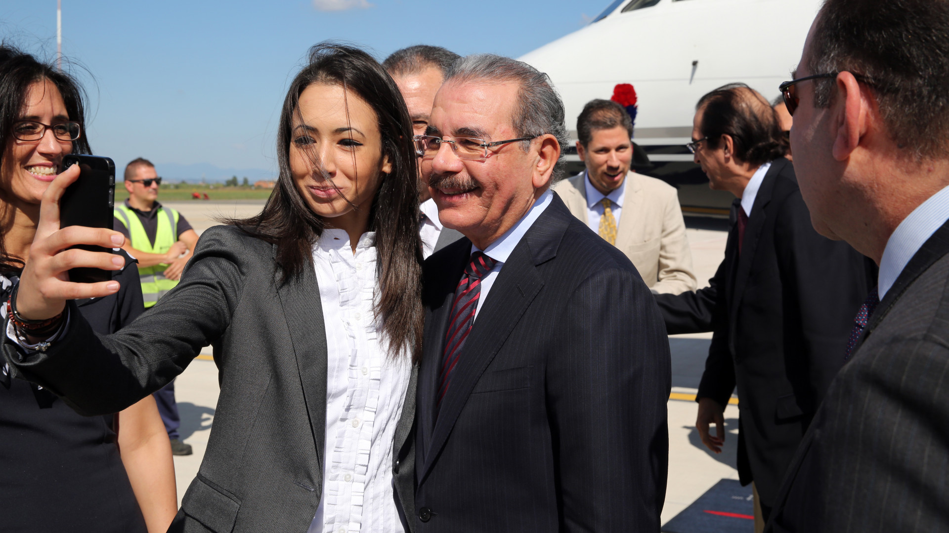 Presidente de la República Danilo Medina junto a integrantes de la comitiva de bienvenida a su llegada al Aeropuerto de Roma-Ciampino.