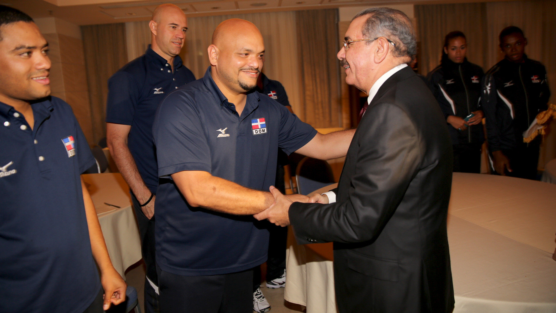 El presidente Danilo Medina salluda a entrenadores e integrantes del equipo de la Selección Nacional Femenina de Voleibol de Mayores, a quienes felicitó por su quinta victoria consecutiva al participar en el Campeonato Mundial de Voleibol en Roma, Italia.