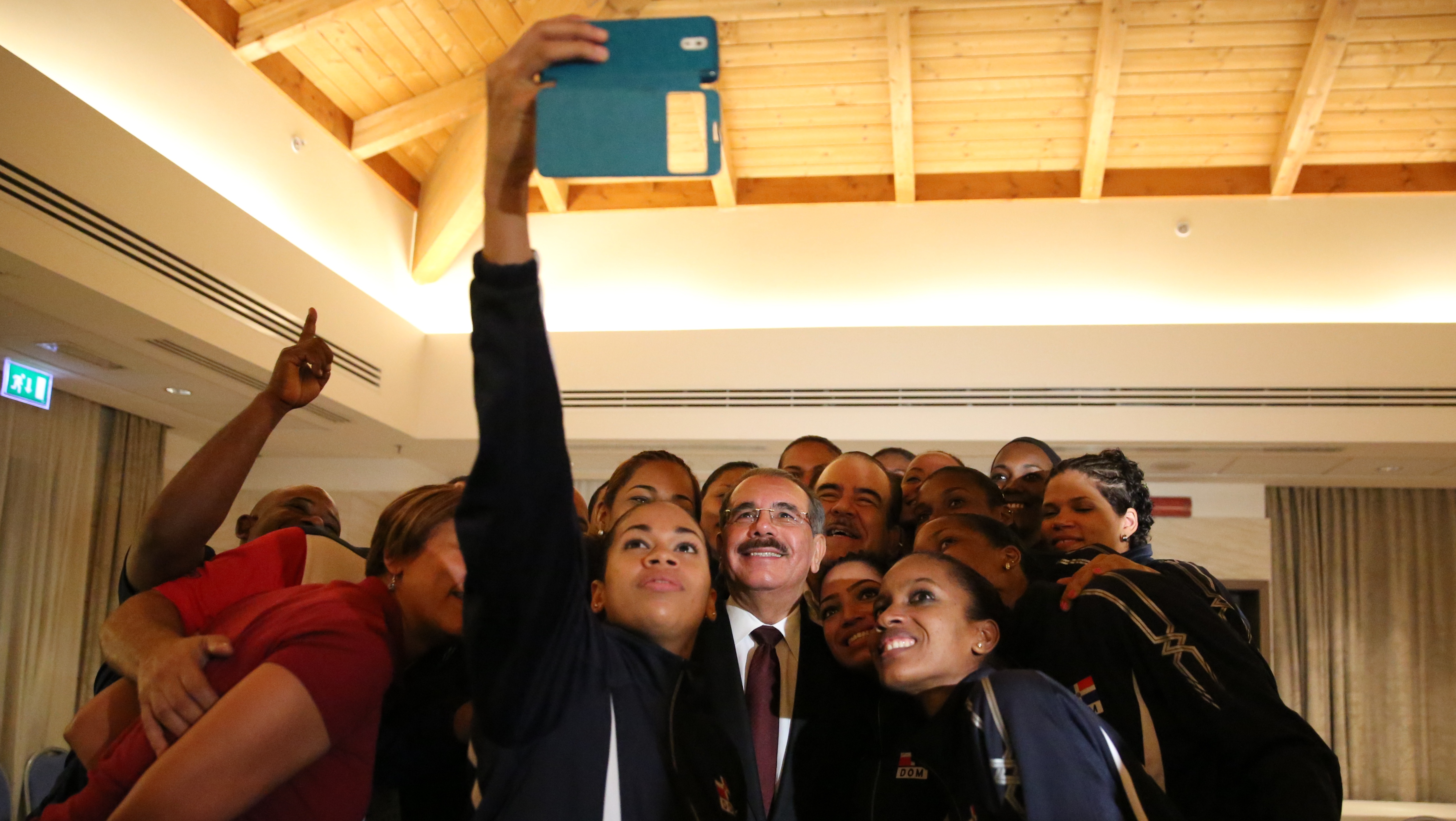 "Selfie" como grato recuerdo de la Selección dominicana Femenina de Voleibol de Mayores, junto al presidente Danilo Medina, quien felicitó al equipo deportivo criollo por su quinta victoria consecutiva al participar en el Campeonato Mundial de Voleibol en Roma, Italia.