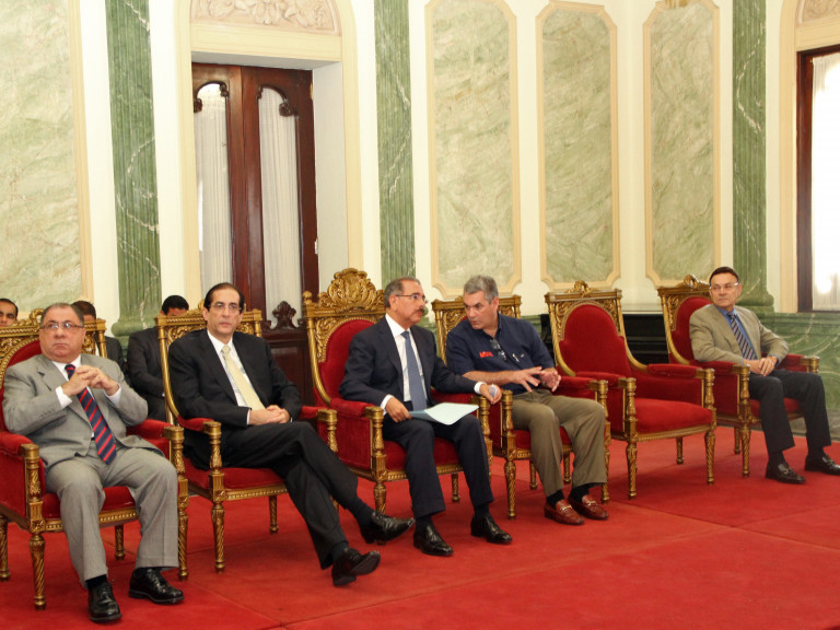 El presidente Medina junto al equipo de funcionarios escogido para dar seguimiento a los trabajos, entre ellos el ministro de Obras Públicas, Gonzalo Castillo, con quien conversa sobre el tema.