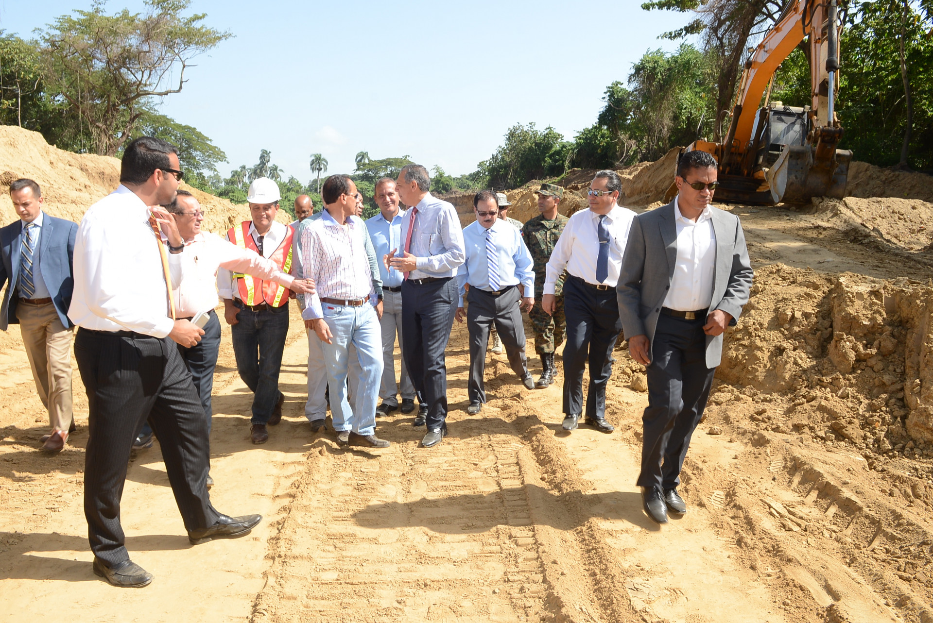 Momentos en que el ministro Administrativo de la Presidencia hace un recorrido por las obras que se realizan, acompañado por el gobernador Andrés Rodríguez, por el ministro de Agricultura, Ángel Estévez; el viceministro Administrativo de la Presidencia, Luis Marte y otras autoridades civiles y militares de la provincia, así como un equipo de ingenieros que labora en los proyectos.
