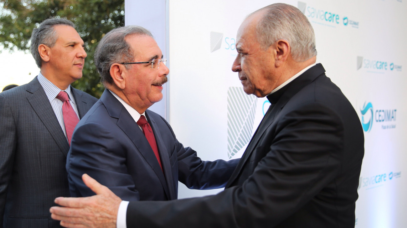 El presidente Danilo Medina es recibido por su eminencia reverendísima, Nicolás De Jesús Cardenal López Rodríguez, presidente del Patronato de la Plaza de la Salud, a su llegada al acto.