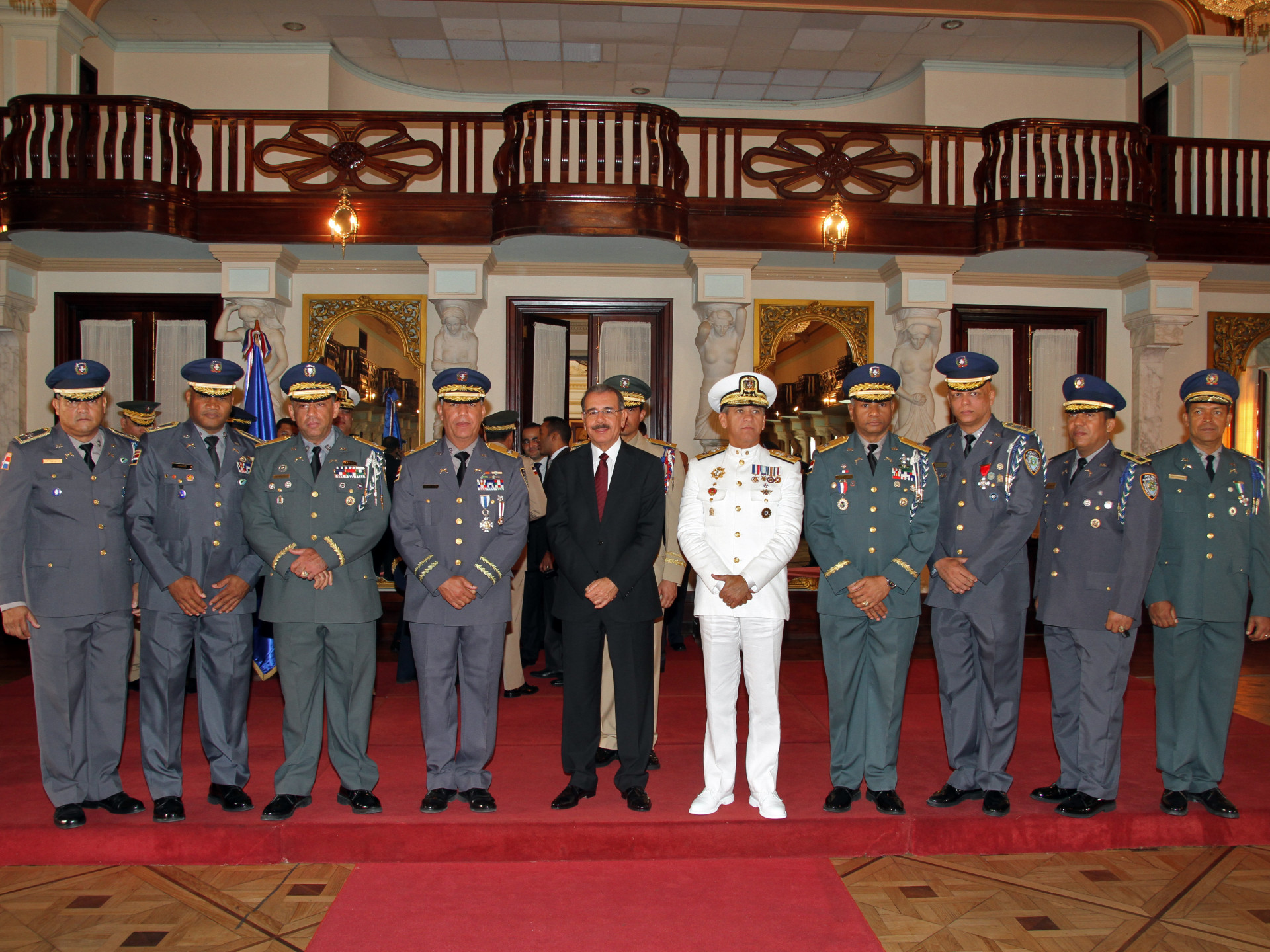 El presidente Medina, junto a ministro de las Fuerzas Armadas, ministro de la Policía Nacional y altos oficiales.