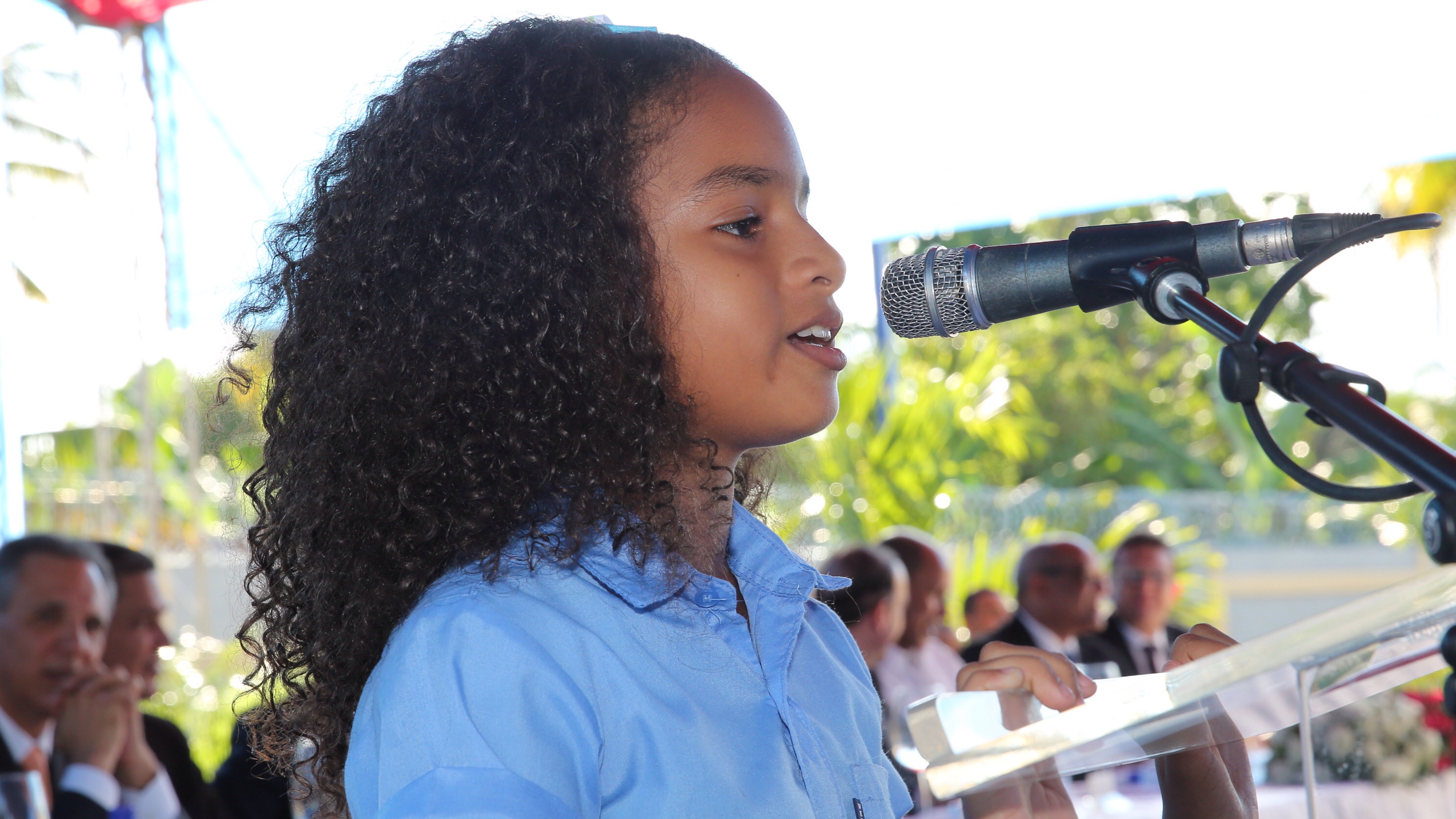 Hengeli González, estudiante de 5to. Grado de básica, quien habló en representación de los estudiantes de Nagua, y expresó que hoy tienen la oportunidad de ampliar sus conocimientos en centros educativos modernos, adaptados a los nuevos tiempos.