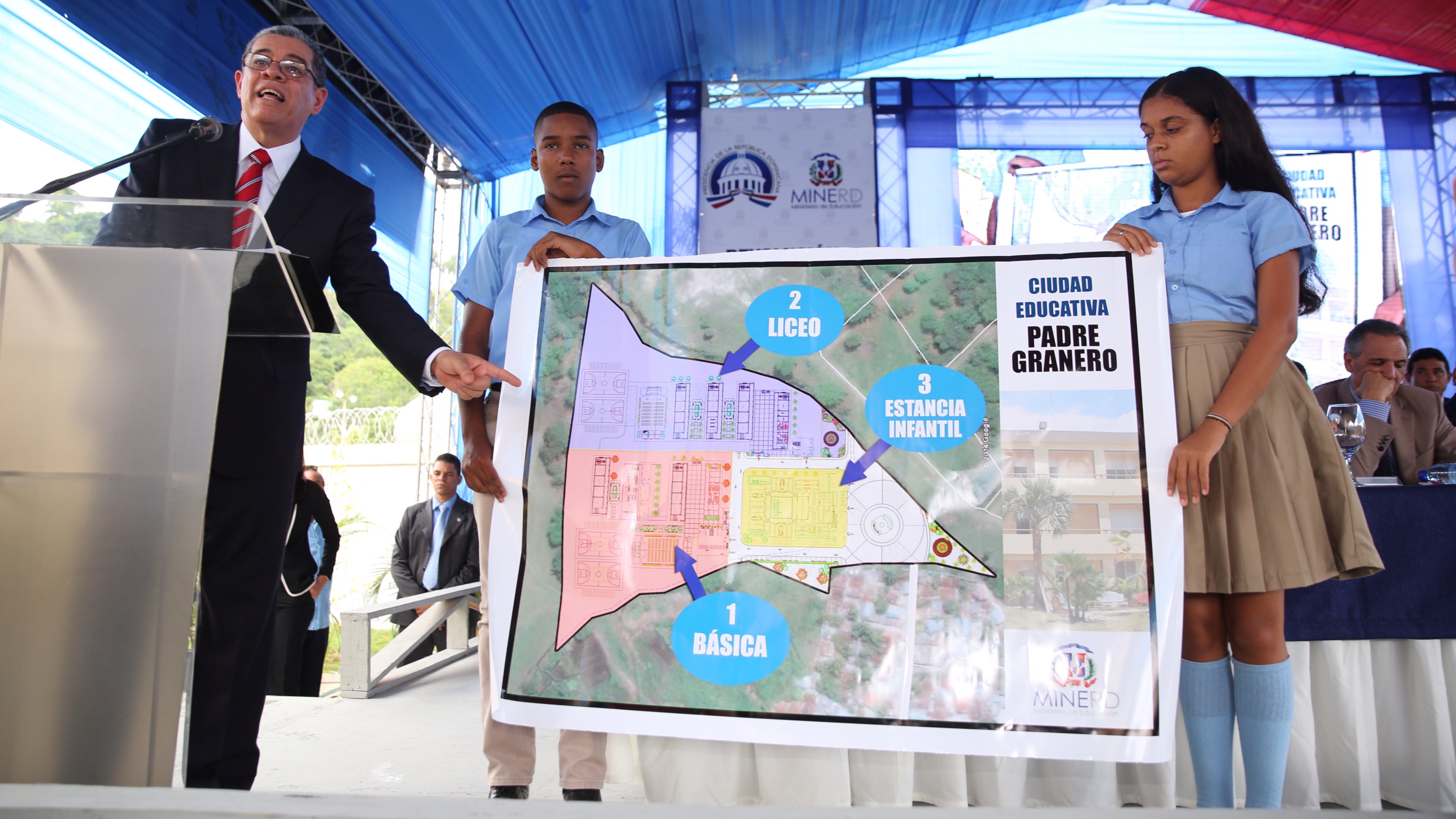 Carlos Amarante Baret, ministro de Educación, al momento de pronunciar el discurso central del acto, anunció la construcción de una ciudad educativa para la comunidad puertoplateña de Padre Granero.