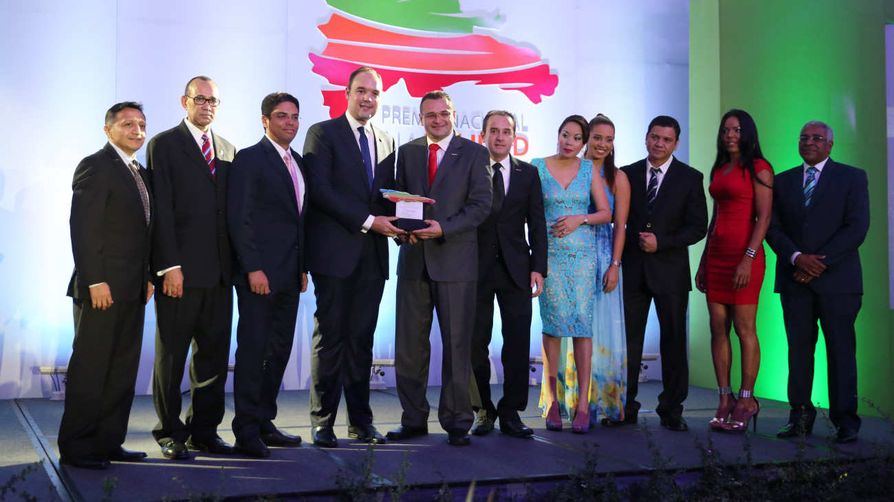 El ministro de Industria y Comercio, José del Castillo, entrega el galardón de Gran Premio Nacional a la Calidad del Sector Privado a ejecutivos de la empresa Bepensa Dominicana.