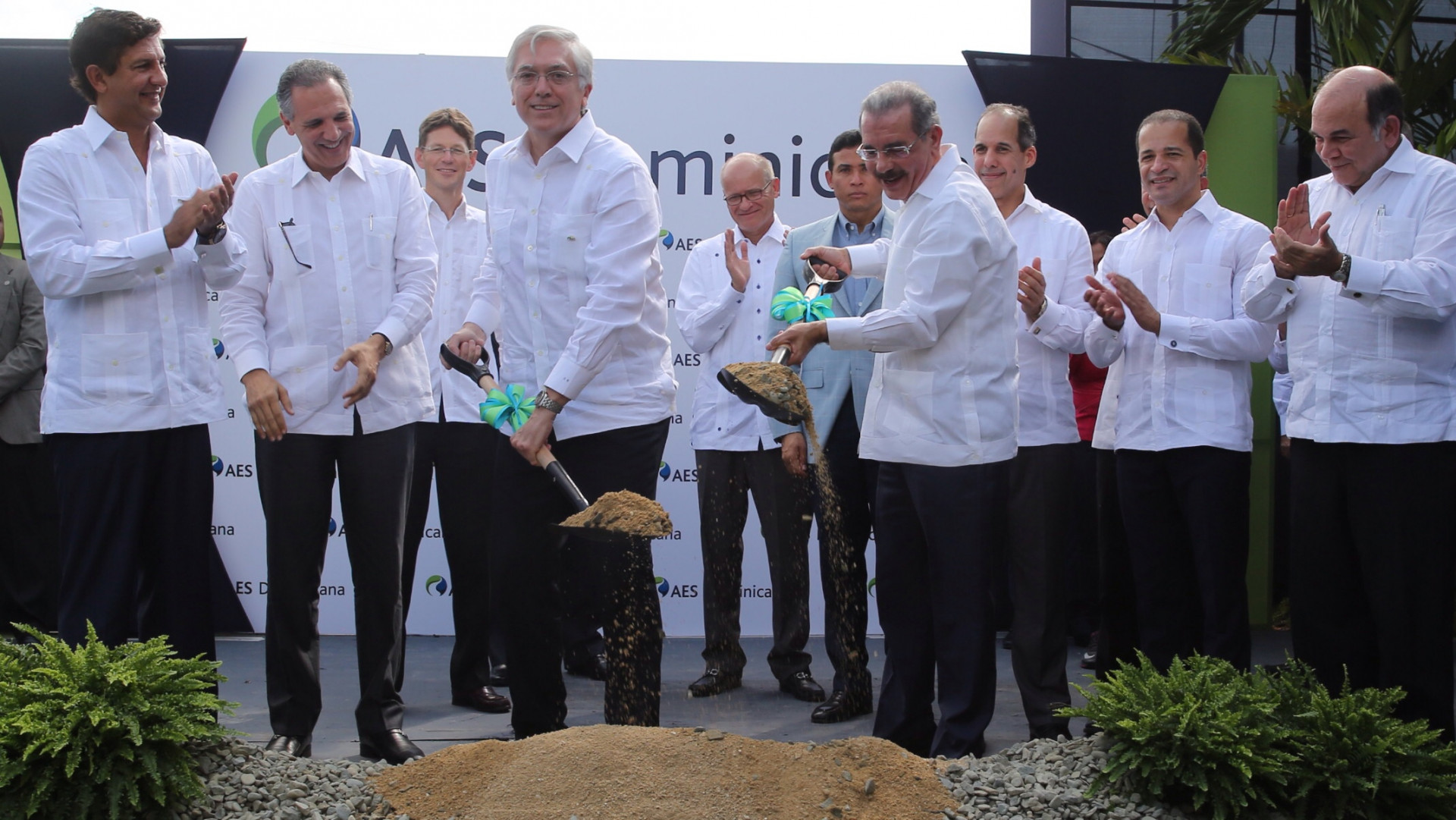 Presidente de la República, Danilo Medina Sánchez y Andrés R. Gluski, presidente y director ejecutivo de AES Corporation, dieron el primer palazo para dejar inaugurados los trabajos de construcción del proyecto. Figuran además, funcionarios del Gobierno, autoridades provinciales, ejecutivos de la empresa, miembros del cuerpo diplomático y otras personalidades invitadas.