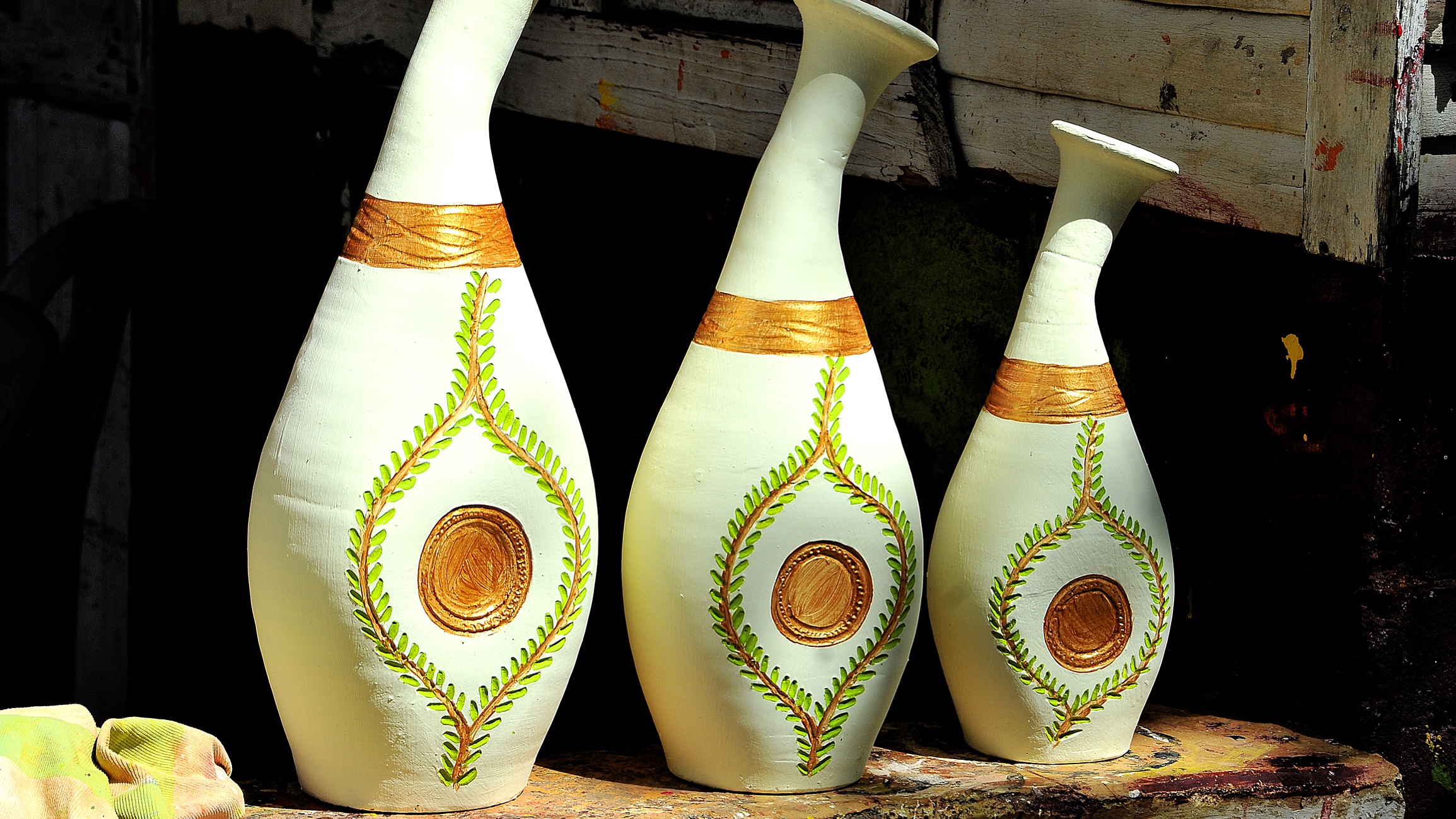 Piezas decorativas terminadas, hechas por artesanos y alfareros agrupados en asociaciones del Cibao.