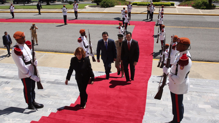 El presidente de Honduras, Juan Orlando Hernández fue recibido con honores a su llegada al Palacio Nacional, acompañado del ministro de Relaciones Exteriores, Andrés Navarro.