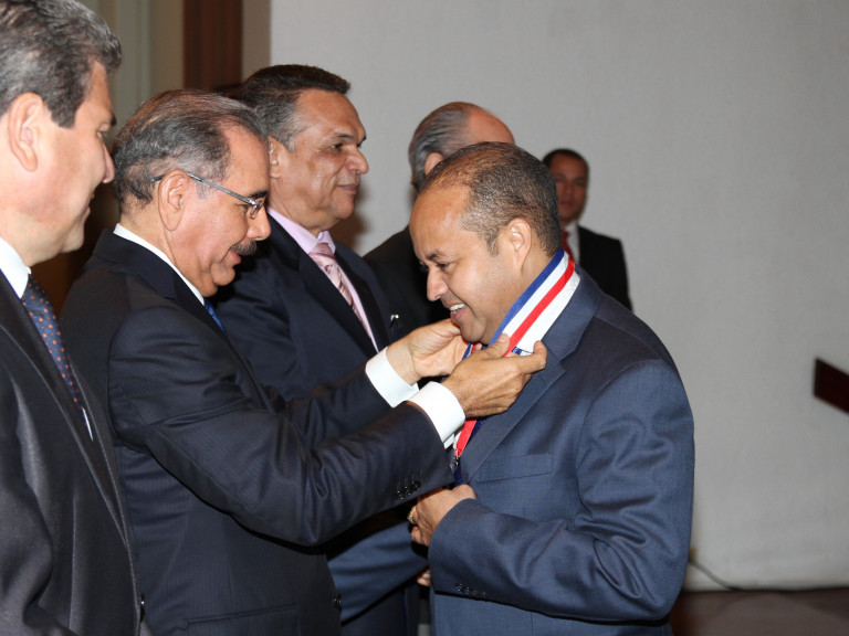 El presidente Medina le coloca la medalla de oro al doctor Félix Hernández, director del Hospital Dr. Ney Arias Lora, en representación del centro de salud.