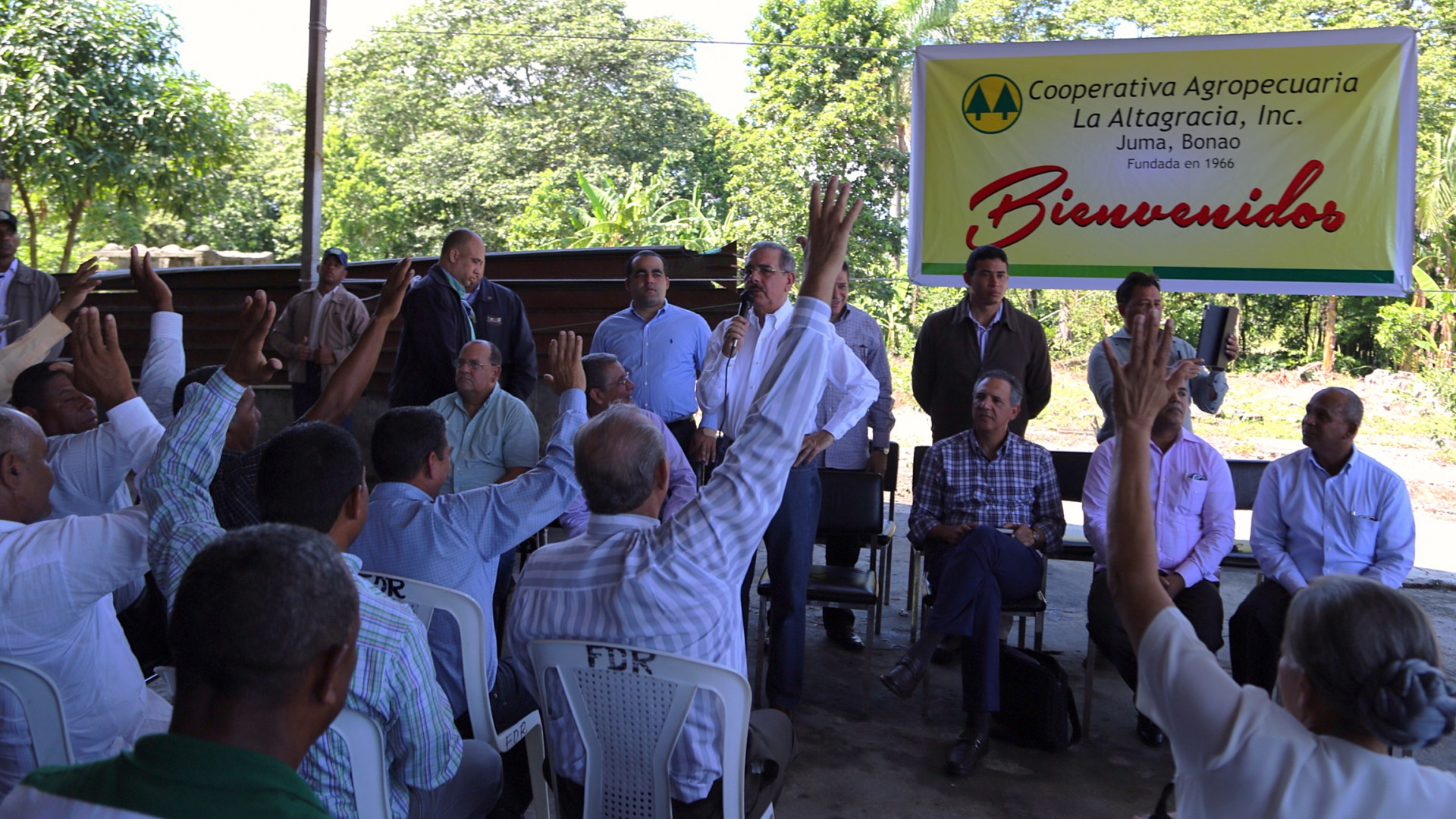 Participantes en el encuentro del presidente Medina con arroceros de Juma, provincia Monseñor Nouel, durante su Visita sorpresa de este domingo.