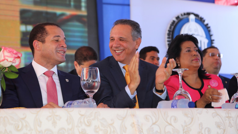 El ministro Administrativo de la Presidencia, José Ramón Peralta, comparte en la mesa de honor con el alcalde del municipio Santo Domingo Este, Juan de los Santos; y la senadora de la provincia Santo Domingo, Cristina Lizardo Mézquita.