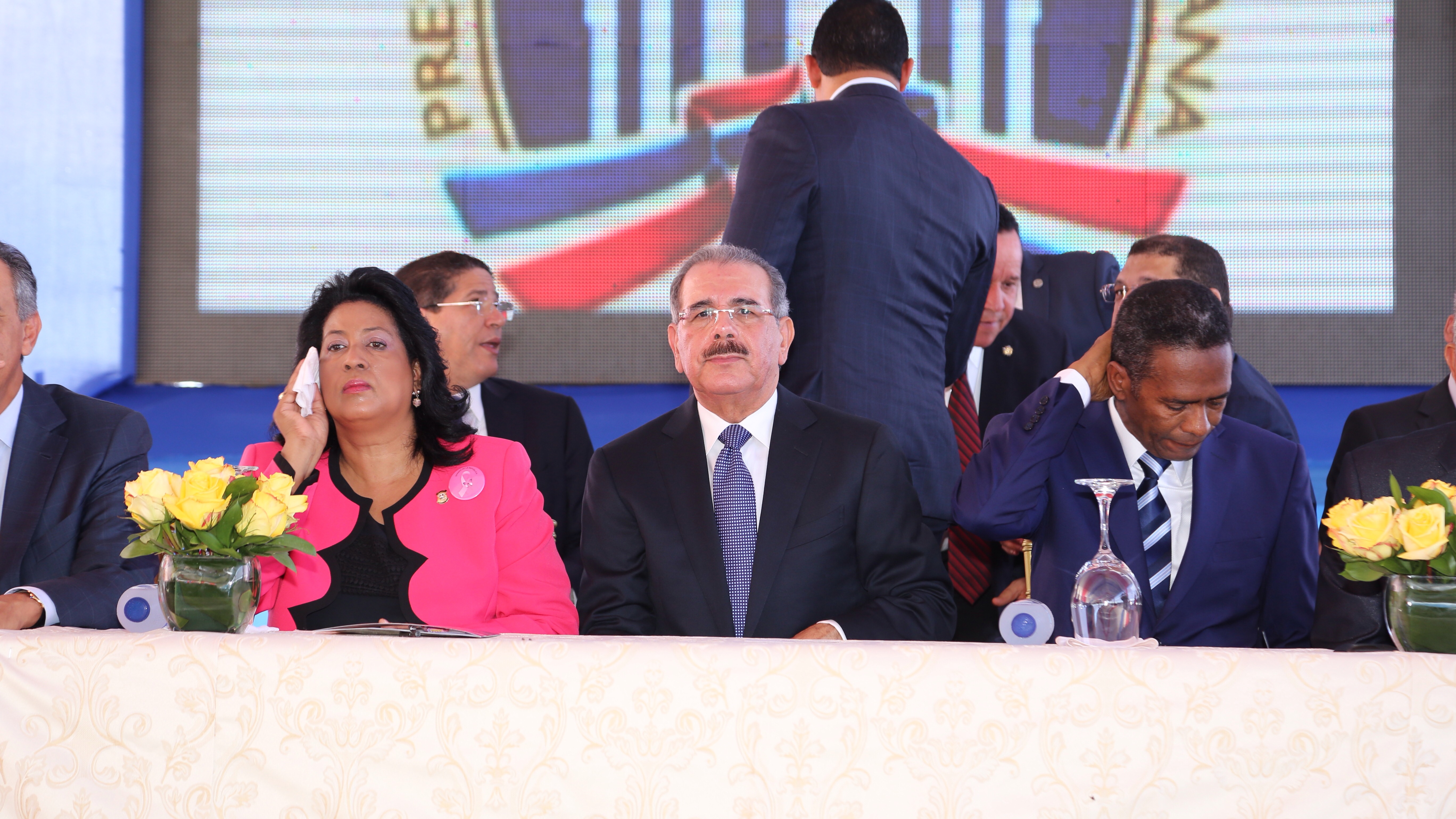 El presidente Danilo Medina encabezó la mesa de honor en el acto inaugura de la obra. Le acompañan, Cristina Lizardo Mézquita, senadora de la provincia Santo Domingo; y Francisco del Valle Ramírez, presidente de la Comisión de Apoyo al Desarrollo Provincial.