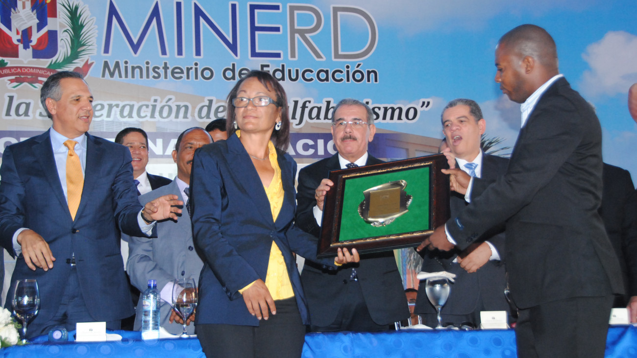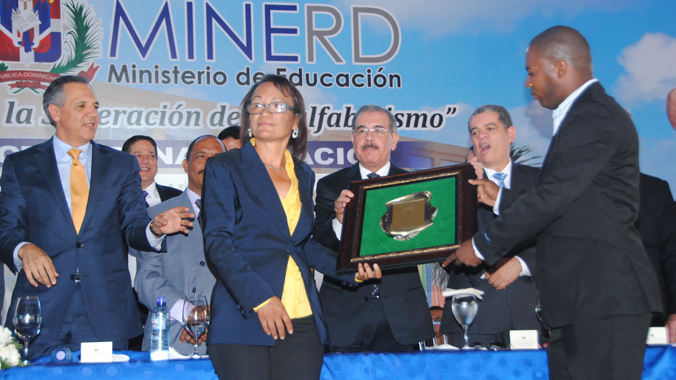 El presidente Danilo Medina recibió una placa de reconocimiento de la Junta de Vecinos Santiago Castro, por contribuir al desarrollo de la comunidad de Haina y su apoyo a la educación, la salud y el empleo.