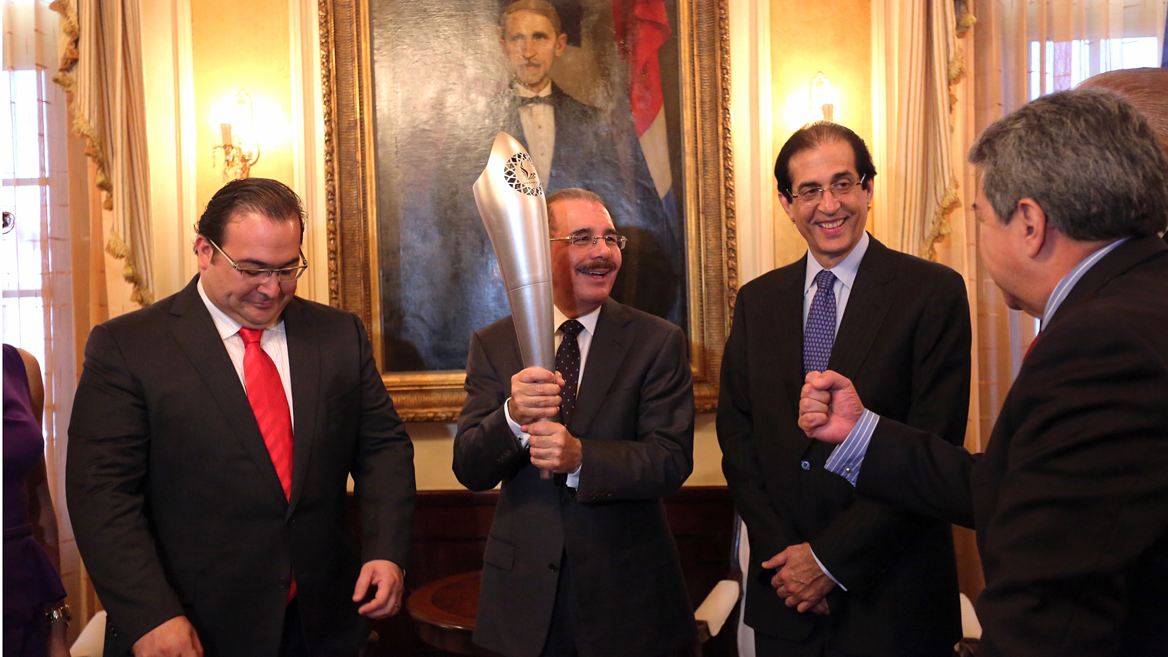 El presidente Danilo Medina recibe del gobernador Javier Duarte de Ochoa una antorcha alusiva a los XXII Juegos Deportivos Centroamericanos y del Caribe 2014, previstos del 14 al 30 de noviembre en Veracruz, México.