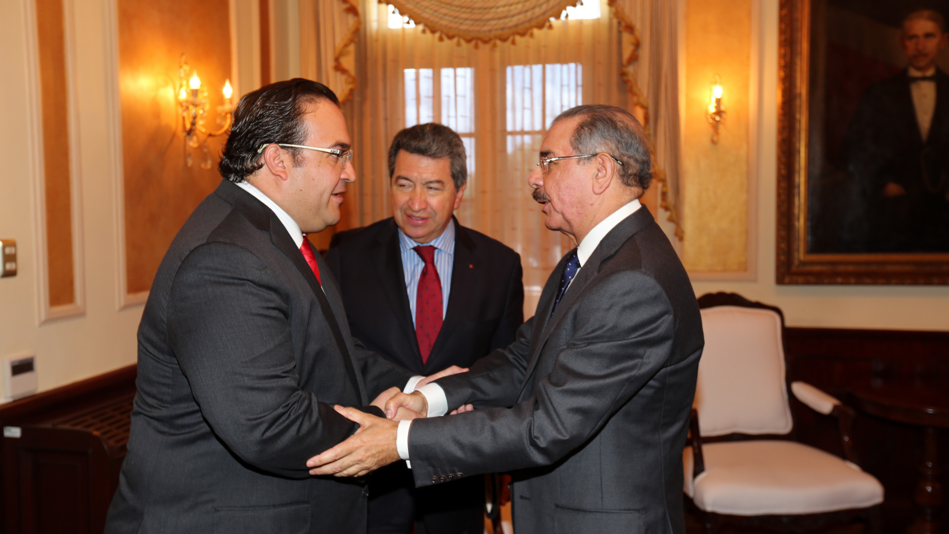 El presidente Danilo Medina saluda al gobernador de Veracruz, México, Javier Duarte de Ochoa, al recibirlo en su despacho del Palacio Nacional, y quien estuvo acompañado del embajador mexicano en la República Dominicana, José Ignacio Piña Rojas.