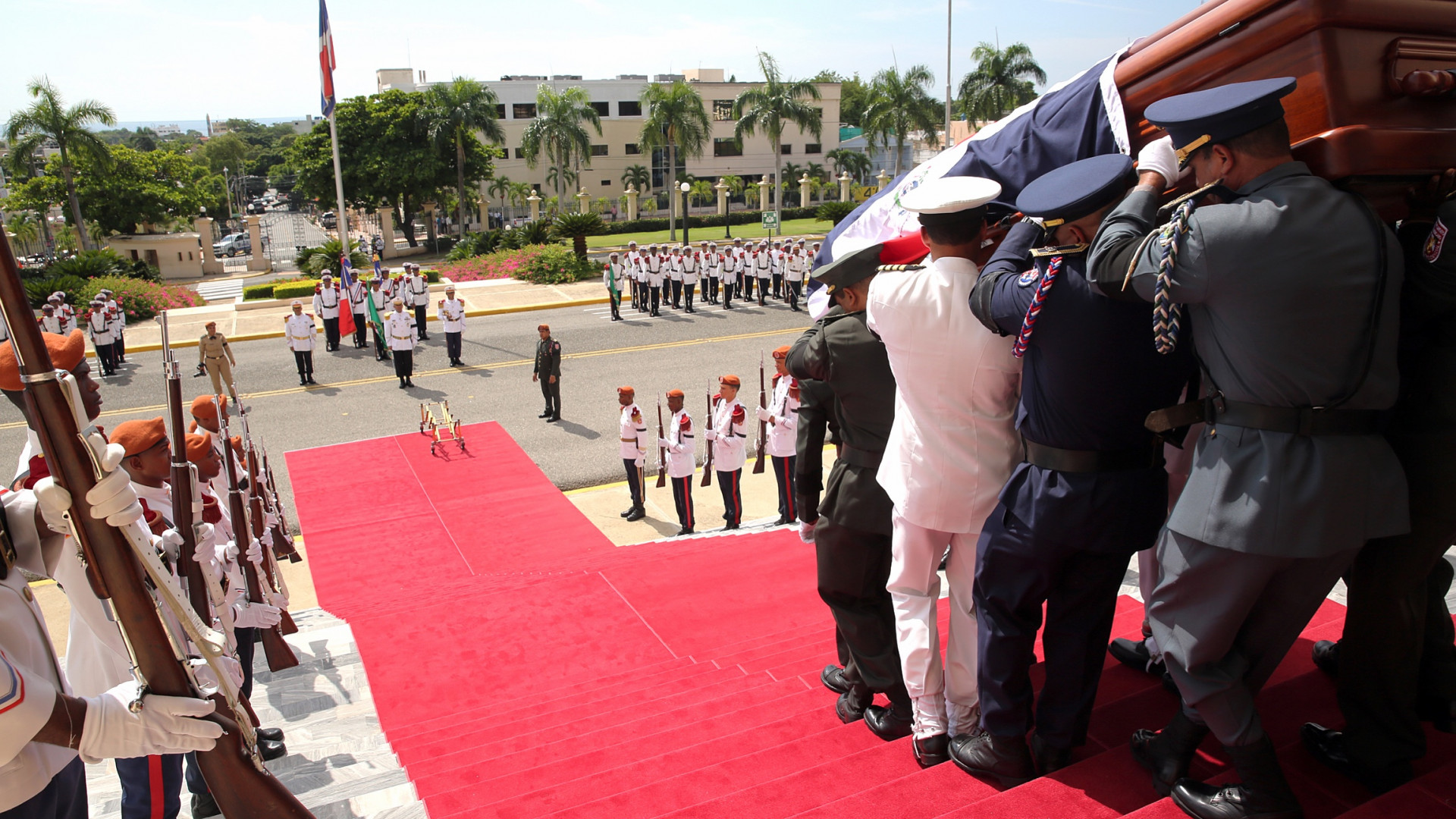 Una Guardia de Oficiales lleva el féretro con los restos de don Carlos Morales Troncoso, luego de recibir los Honores de Estado en el Palacio nacional.