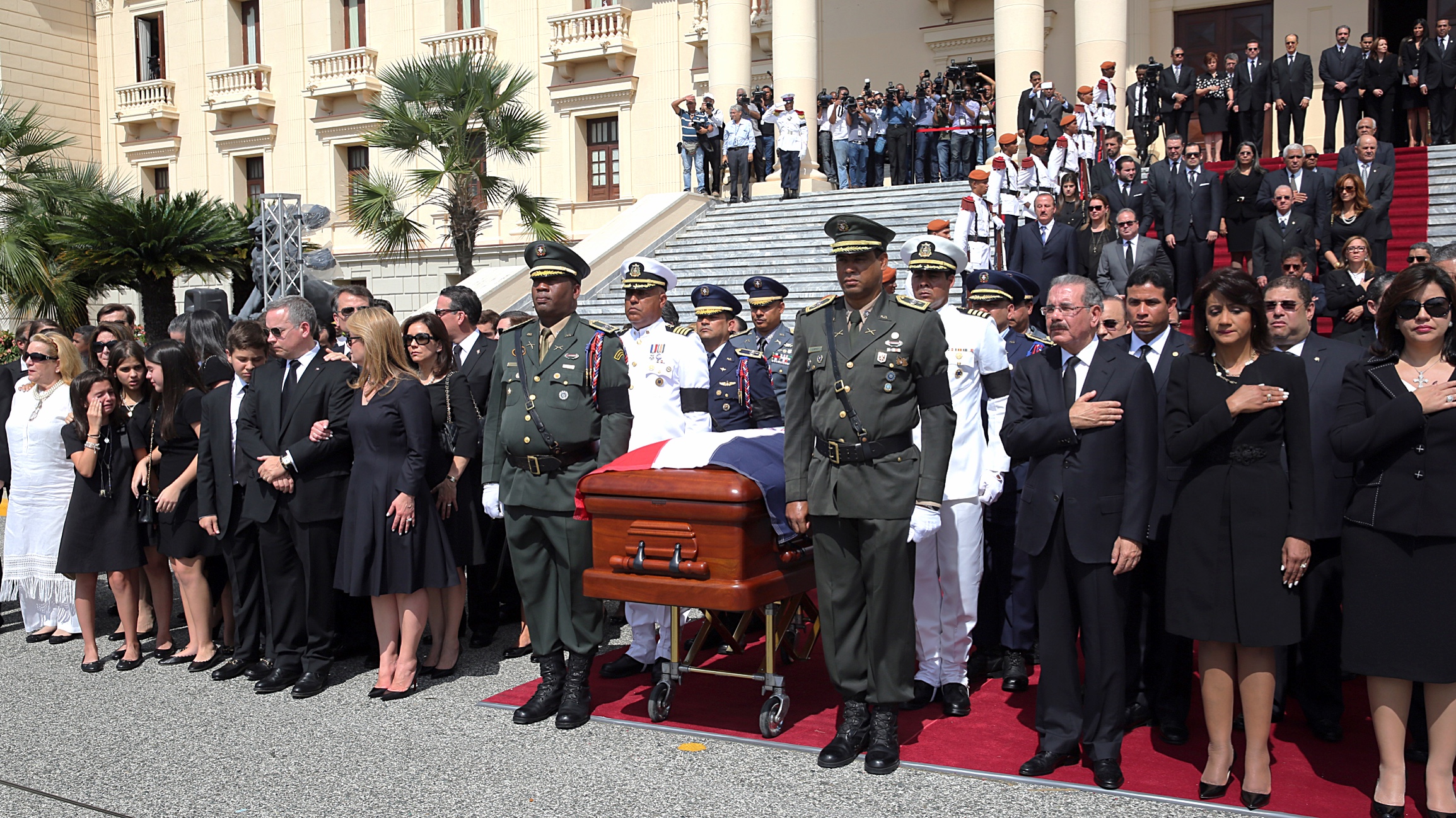 El presidente Danilo Medina, la primera dama Cándida Montilla de Medina, la vicepresidenta Margarita Cedeño de Fernández, familiares, funcionarios, diplomáticos, políticos y personalidades, ante el féretro con los restos de don Carlos Morales Troncoso, durante los Honores de Estado, realizados en el Palacio Nacional.