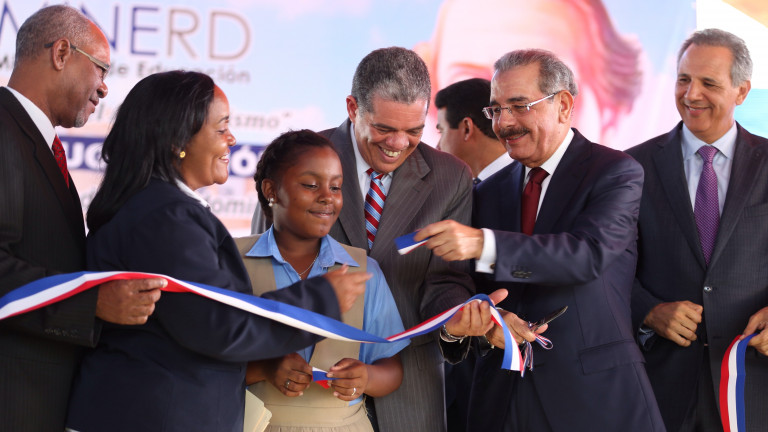 El presidente Danilo Medina, durante un acto conjunto realizado en la Escuela Básica Profesor Agustín Berroa de San Pedro de Macorís, entregó los planteles escolares a estudiantes y comunitarios del Este.