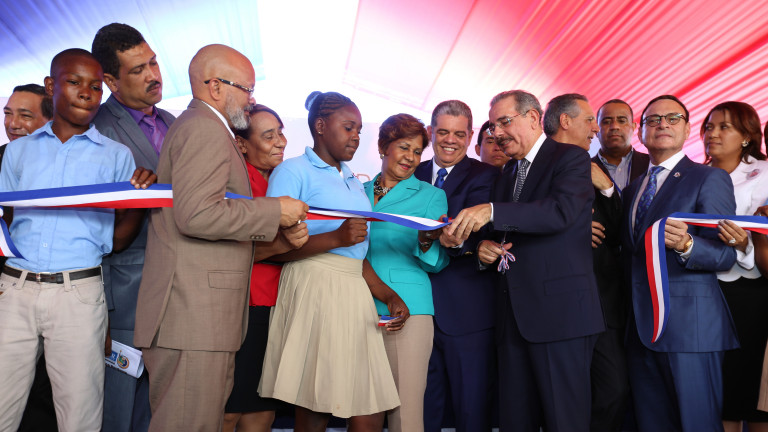 El presidente Danilo Medina realiza el corte de cinta para dejar inaugurado el liceo "Profesora Milagros Núñez" en Guaymate, La Romana.