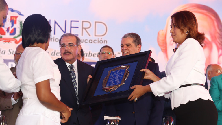 La familia Lorenzo Núñez entregó una placa de reconocimiento al presidente Danilo Medina por hacer realidad el sueño de la profesora Milagros Núñez, construyendo un liceo en esta comunidad.