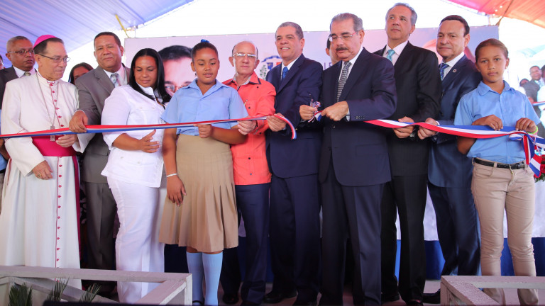 El presidente Danilo Medina corta la cinta en la Escuela Básica "Concepción Bona" de la Laguna de Nisibón para dejar inauguradas, de manera simultánea, 110 nuevas aulas para la jornada de Tanda Extendida en las provincias La Altagracia, La Romana, San Pedro de Macorís y Monte Plata a beneficio de 3,850 estudiantes.