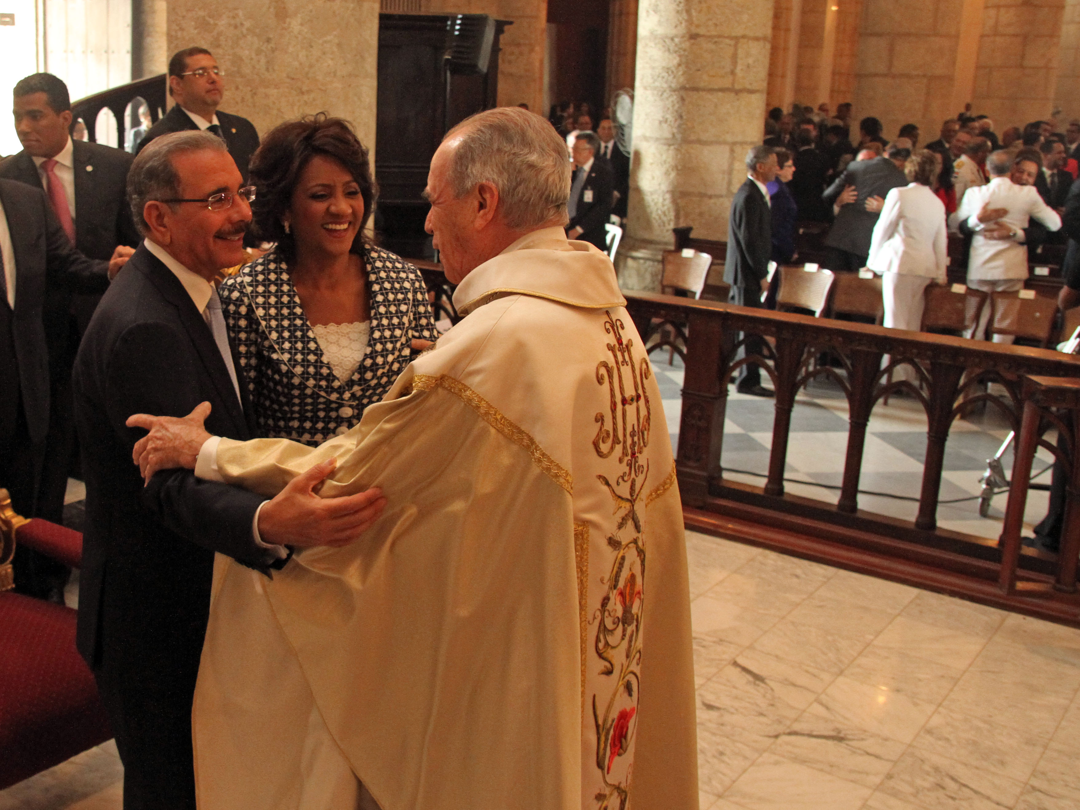 Pareja presidencial recibiendo los saludos del cardenal Nicolás de Jesús López Rodríguez.