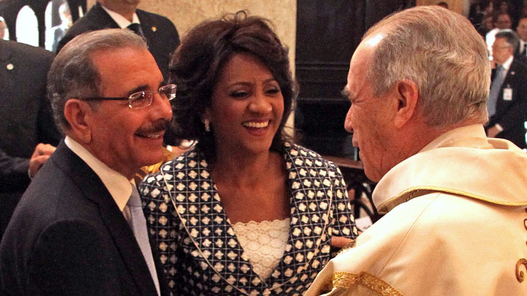Pareja presidencial recibiendo los saludos del cardenal Nicolás de Jesús López Rodríguez.