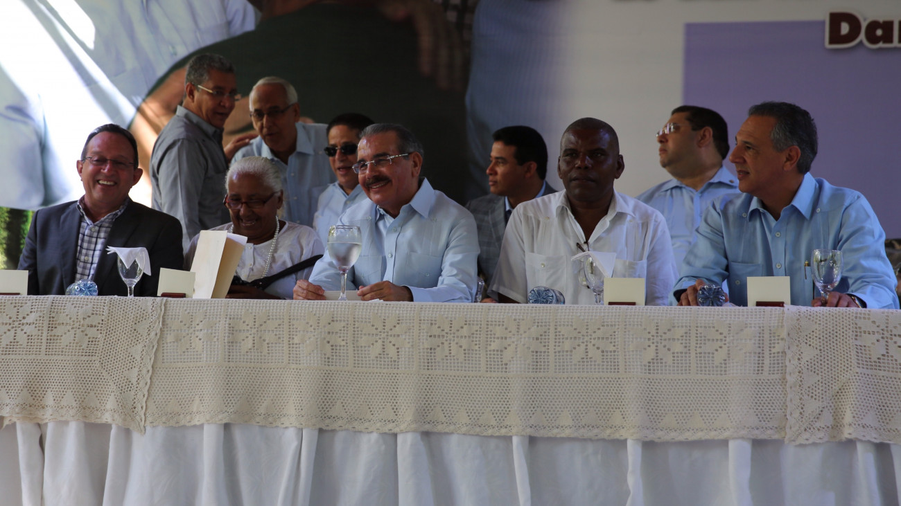 Presidente Danilo Medina junto funcionarios gubernamentales, directivos del Movimiento Campesino Dominicano (MCD), y productores agropecuarios, presentes en el evento.