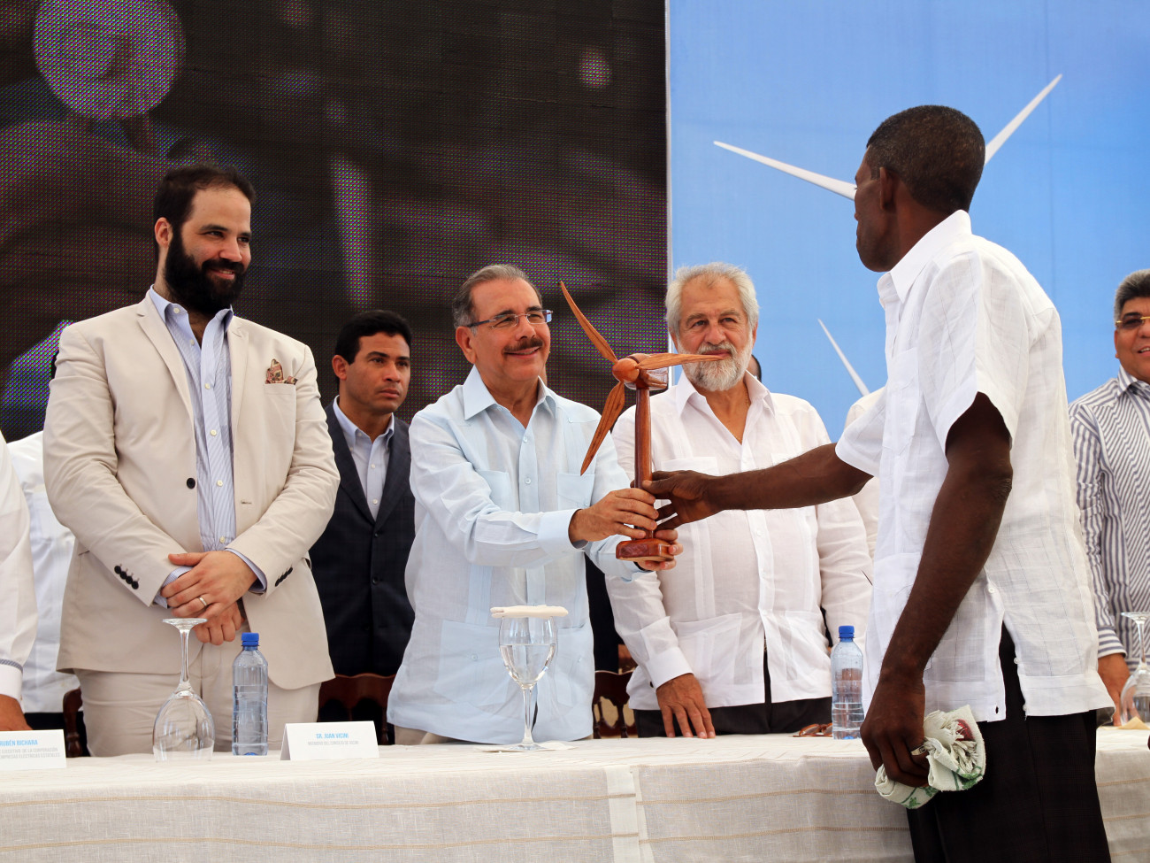 El presidente Danilo Medina recibe un aerogenerador en miniatura, tallado en madera por el artesano Carlos José Montero.