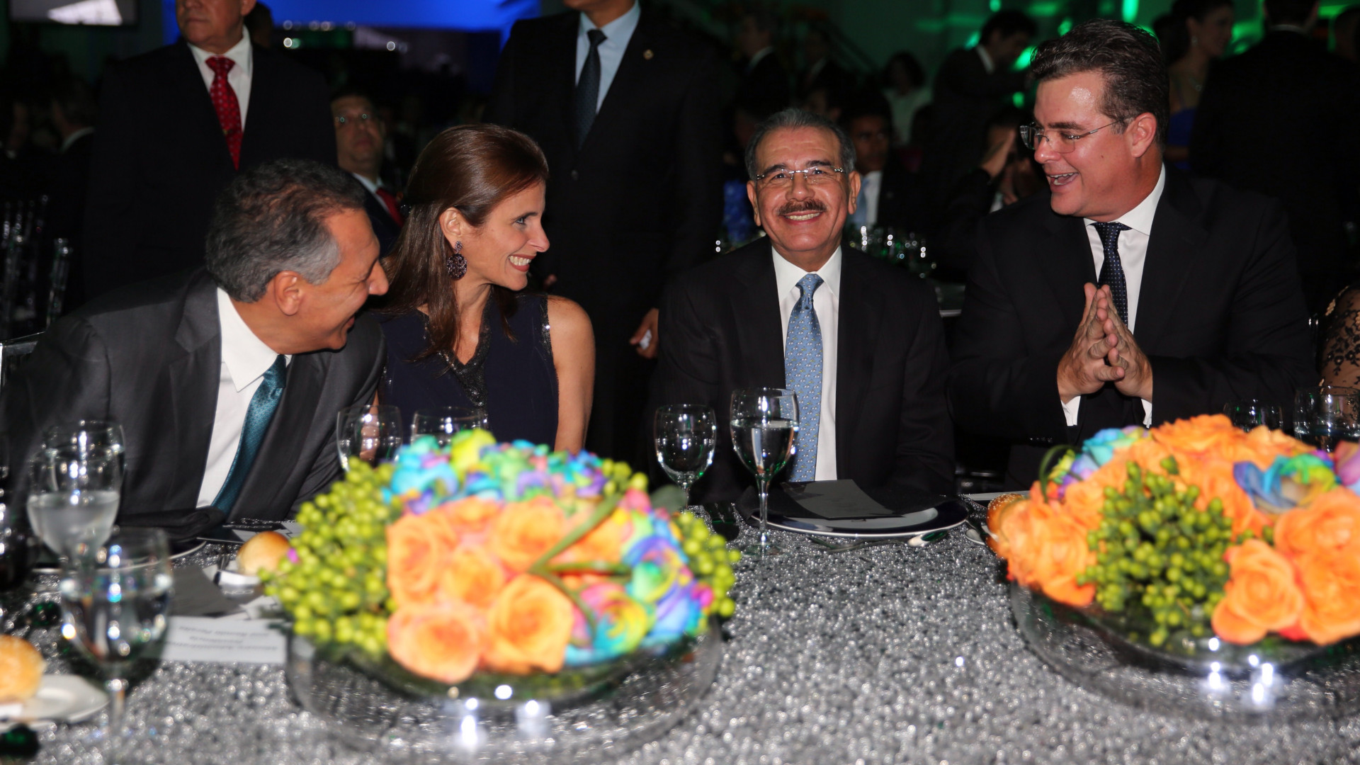 El presidente Danilo Medina, el ministro Administrativo de la Presidencia, José Ramón Peralta y los empresarios, Manuel Diez Cabral y Ligia Bonetti, presidenta de la Asociación de Industrias (AIRD), encabezan la mesa principal.